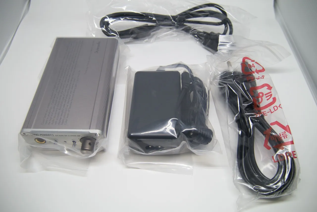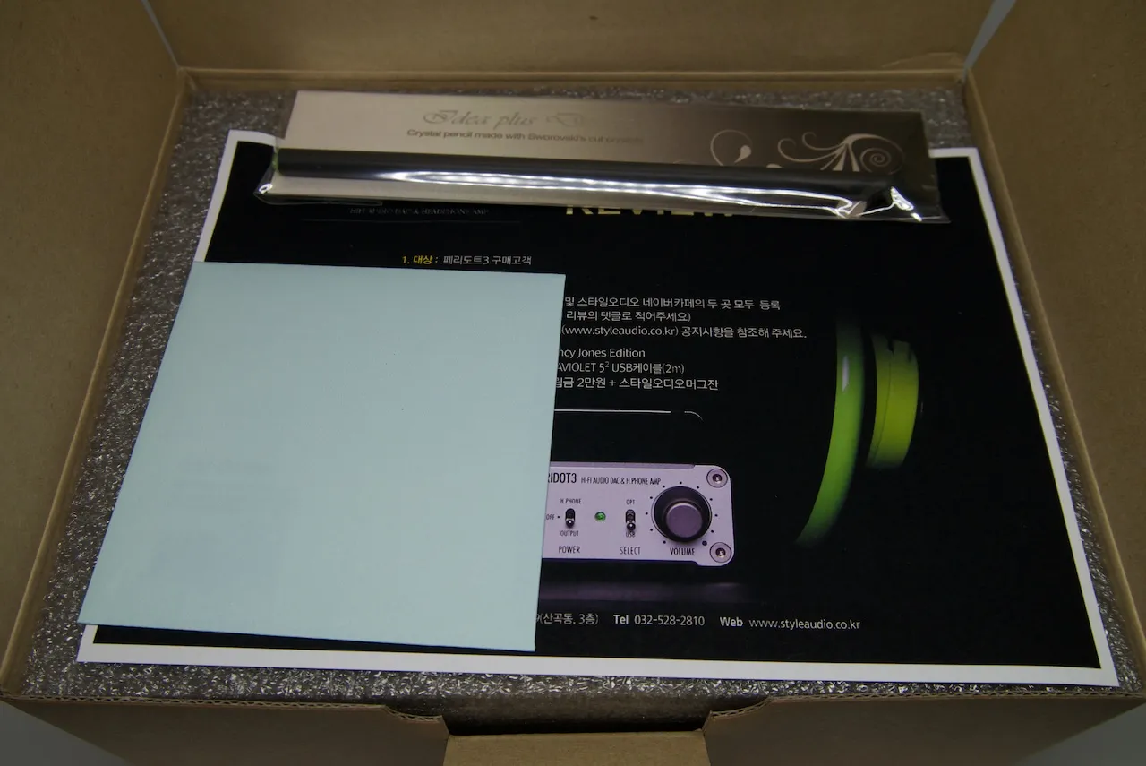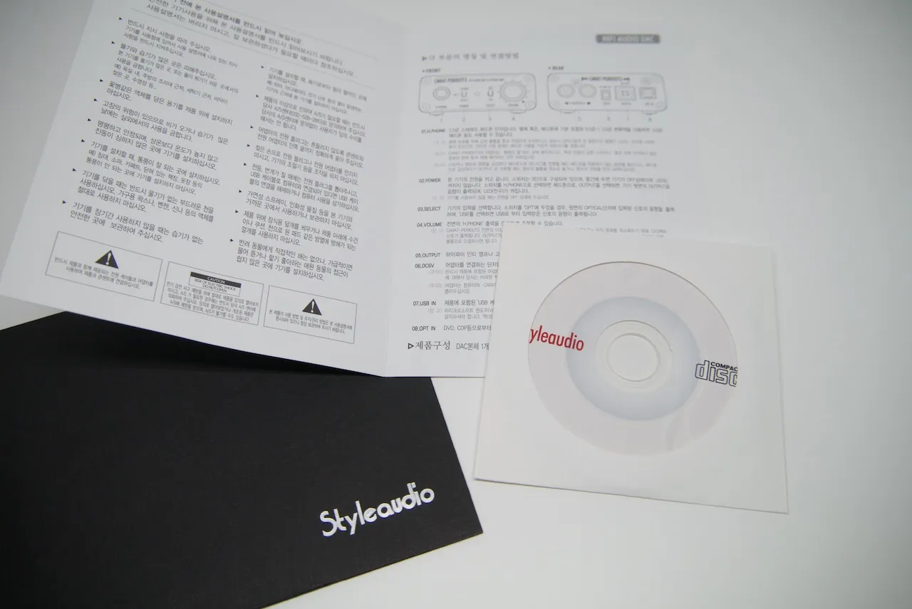 DAC 본체, 전원케이블, USB 케이블, 드라이버시디, 기타 종이 쪼가리