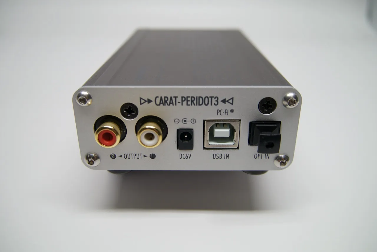 뒷면은 아날로그 아웃풋, 전원, USB 입력, 광입력 단자로 구성되어 있다.