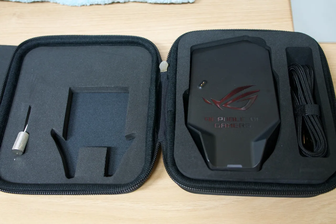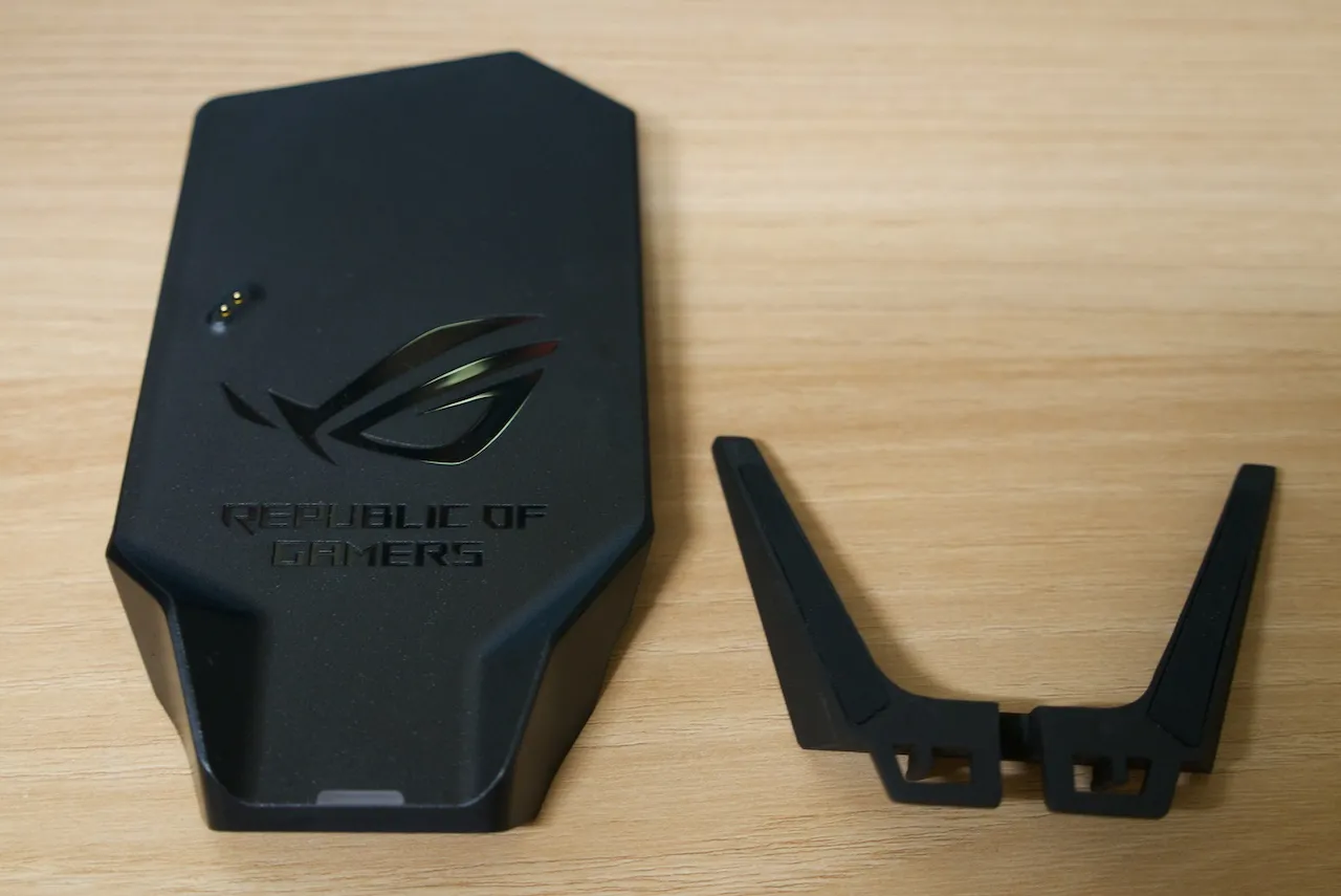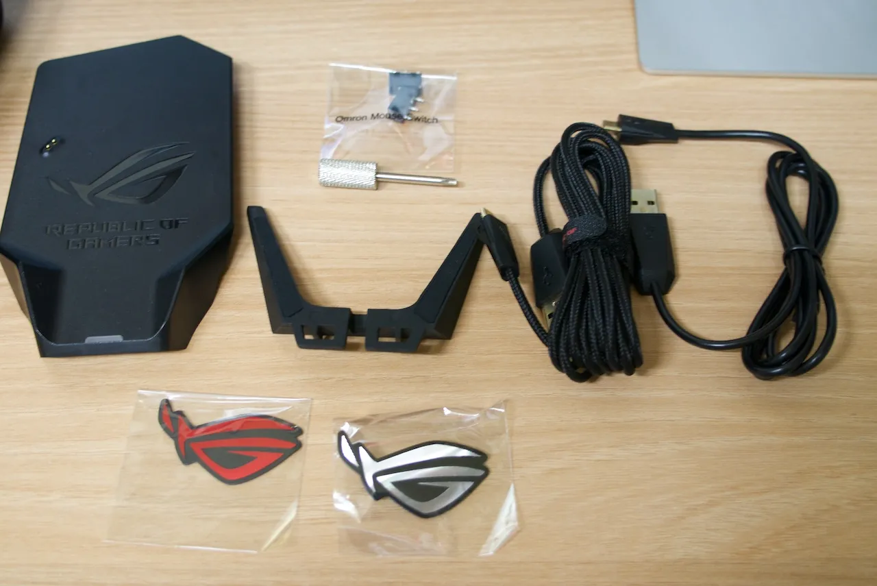 케이블과 충전 거치대 ROG스티커 그리고 여분 스위치(옴론)와 도구가 있다.
