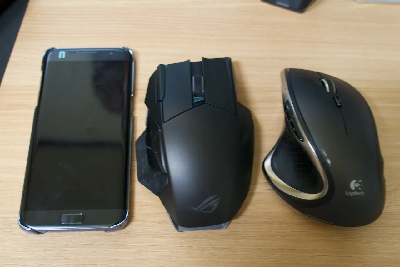 대략 크기 비교를 위해 갤럭시 S7 엣지와 로지틱 퍼포먼스 MX를 두었다.