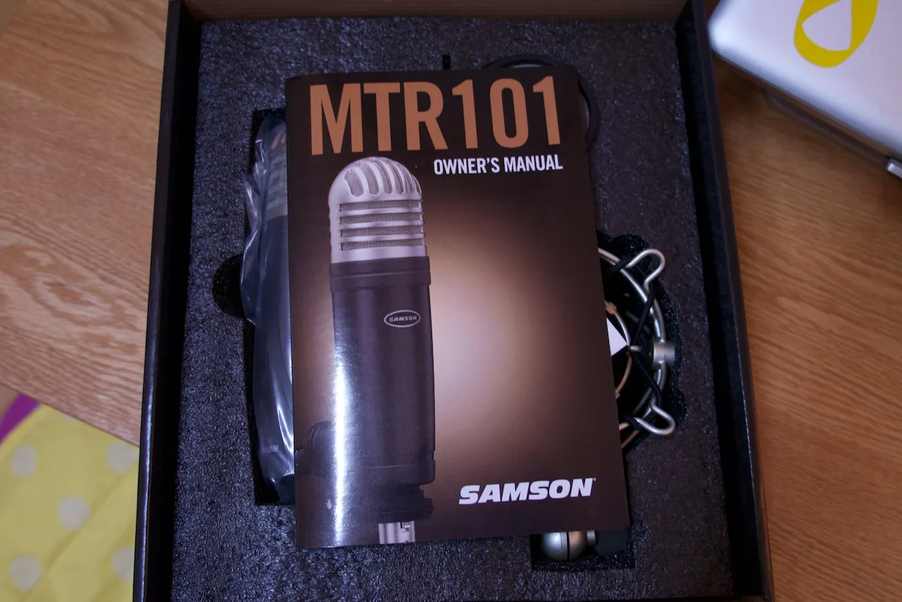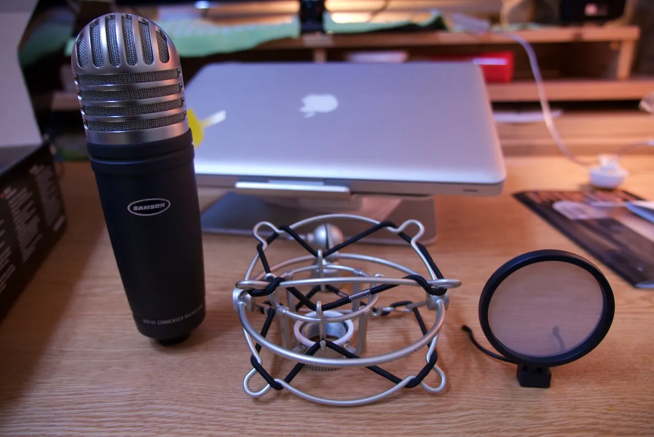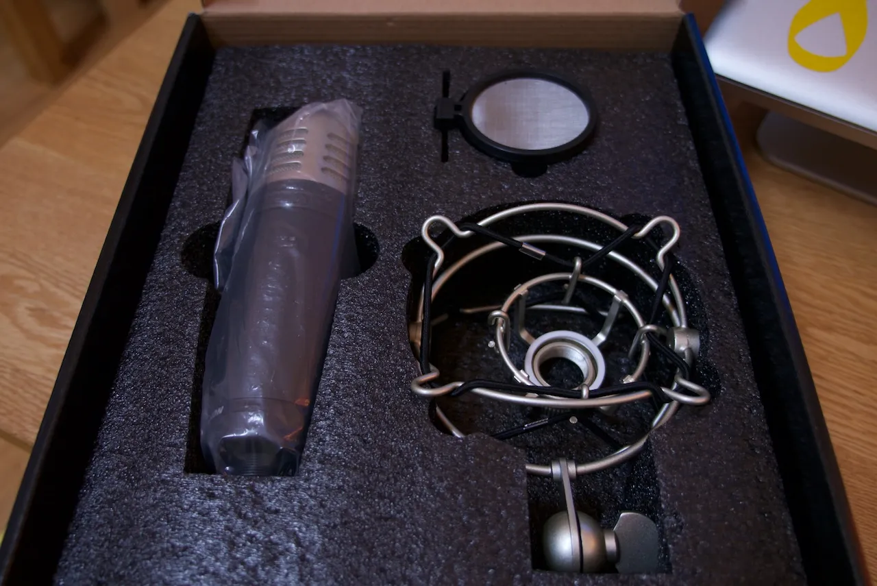 제품의 구성은 콘덴서 마이크, 작은 팝노이즈 필터, 그리고 마운트가 있다.