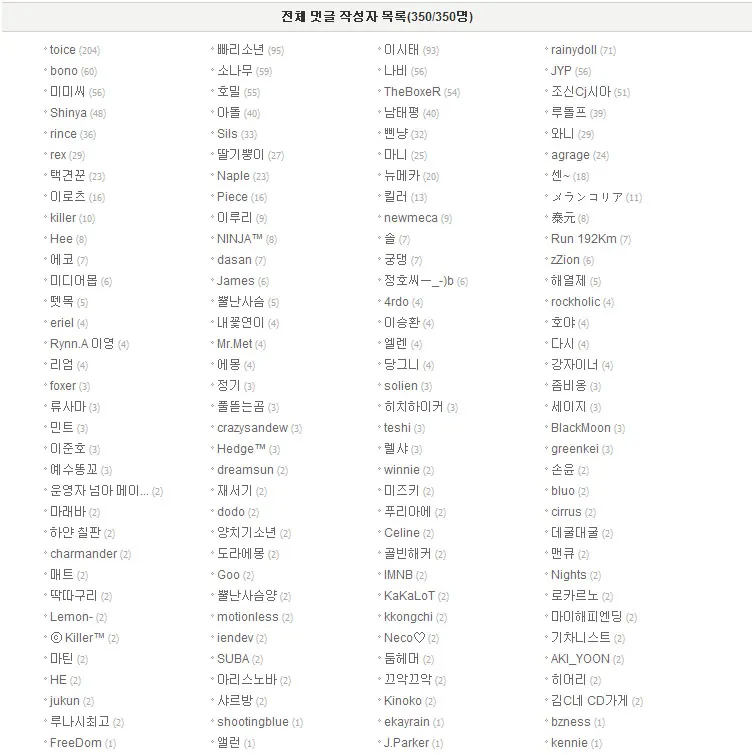 6년여동안 350분(익명 및 악플러 포함;;)께서 댓글을 달아주셨다. 블로그 하면서 가장 오래 알고지내는(물론 넷상으로만) 토이스군께서 무려 200여개가 넘는 댓글을 달아주었다.