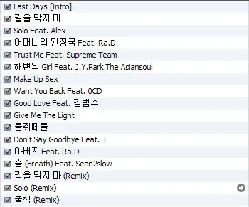 타이틀곡인 solo는 알렉스가 해변의 Girl은 박진영, good love는 김범수, 그외 나는 잘 모르지만 엄청 실력있는 힙합뮤지션들과의 조화로 더욱더 간지나는 앨범을 만들어 준다.