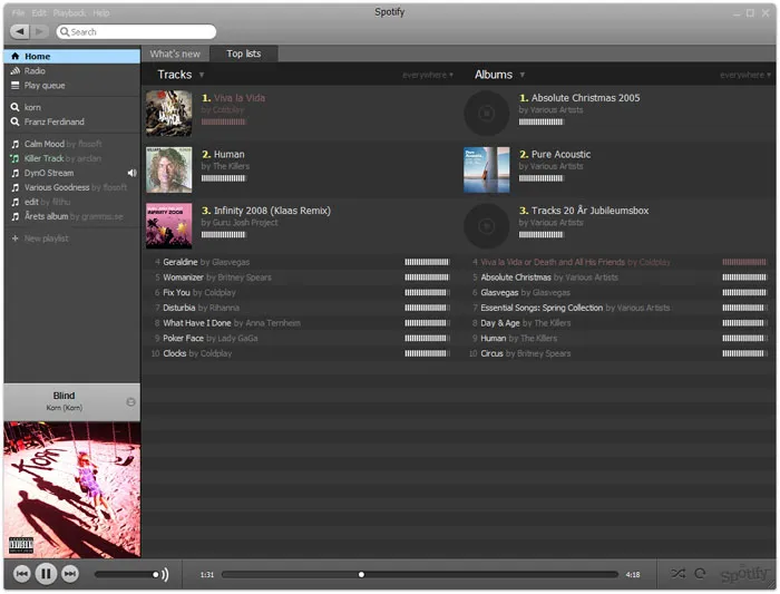 메인에서 Top lists를 클릭하면 Spotiify 내에서 가장 인기 있는 곡과 앨범을 볼수 있다.