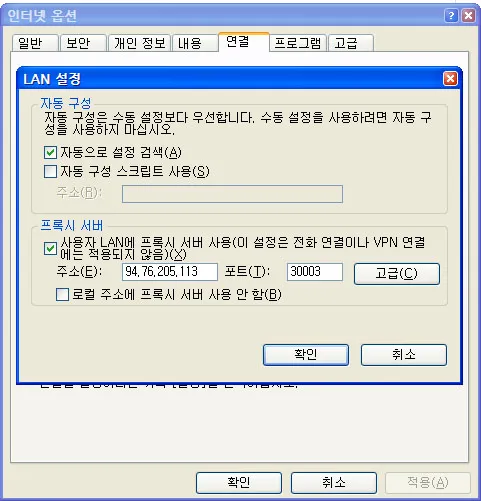 그리고 인터넷 익스플로러 설정에 들어가서 아래의 그림과 같이 위의 사이트에 적힌 아이피와 포트를 입력하고 확인을 누른후 다시 IE를 실행한다.