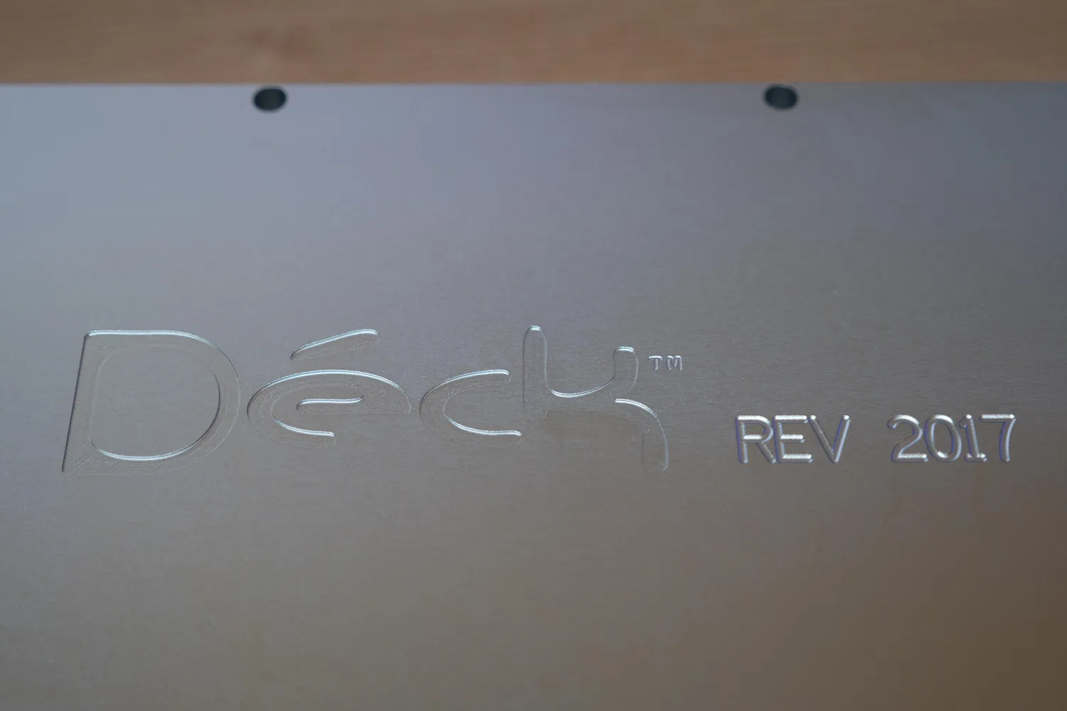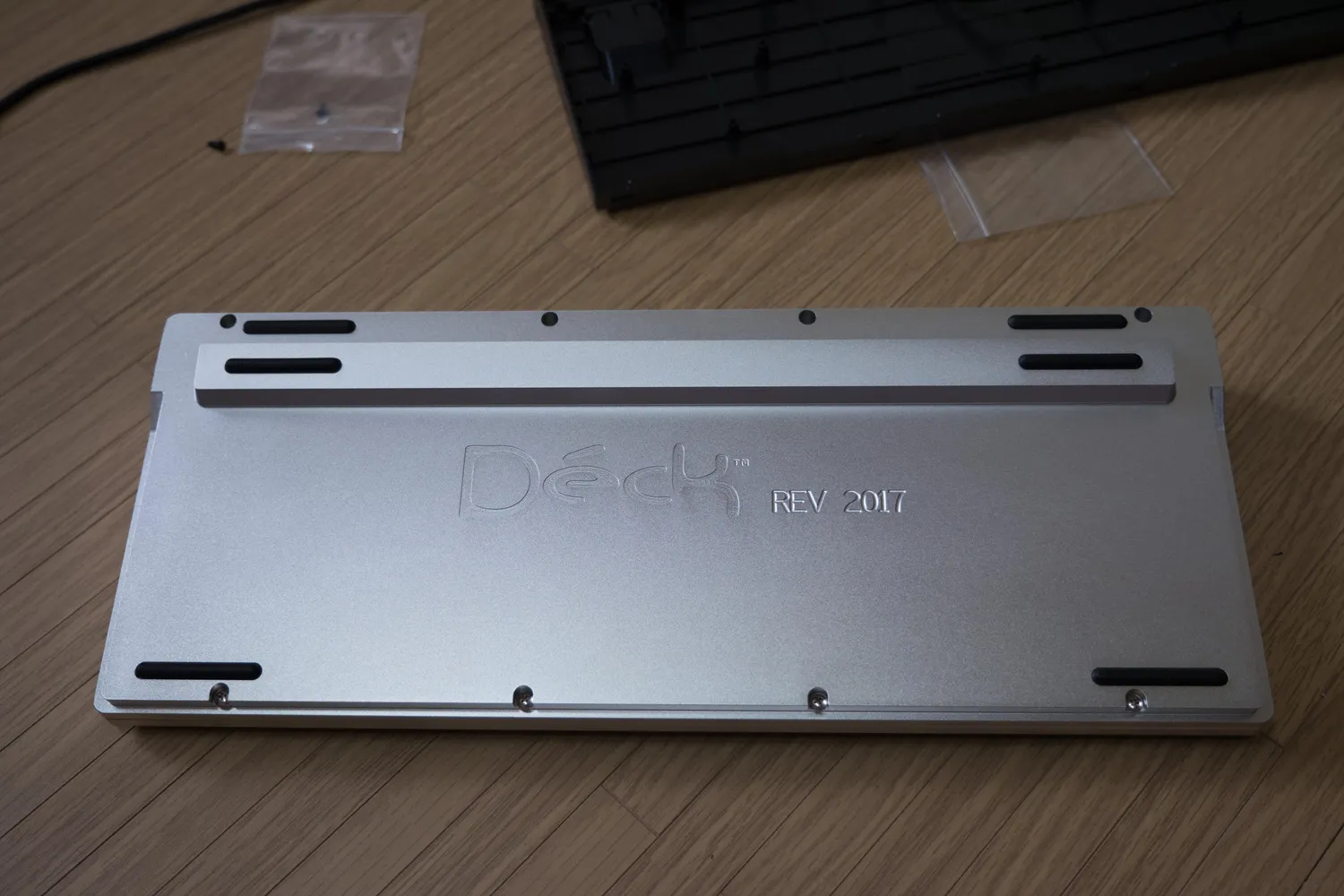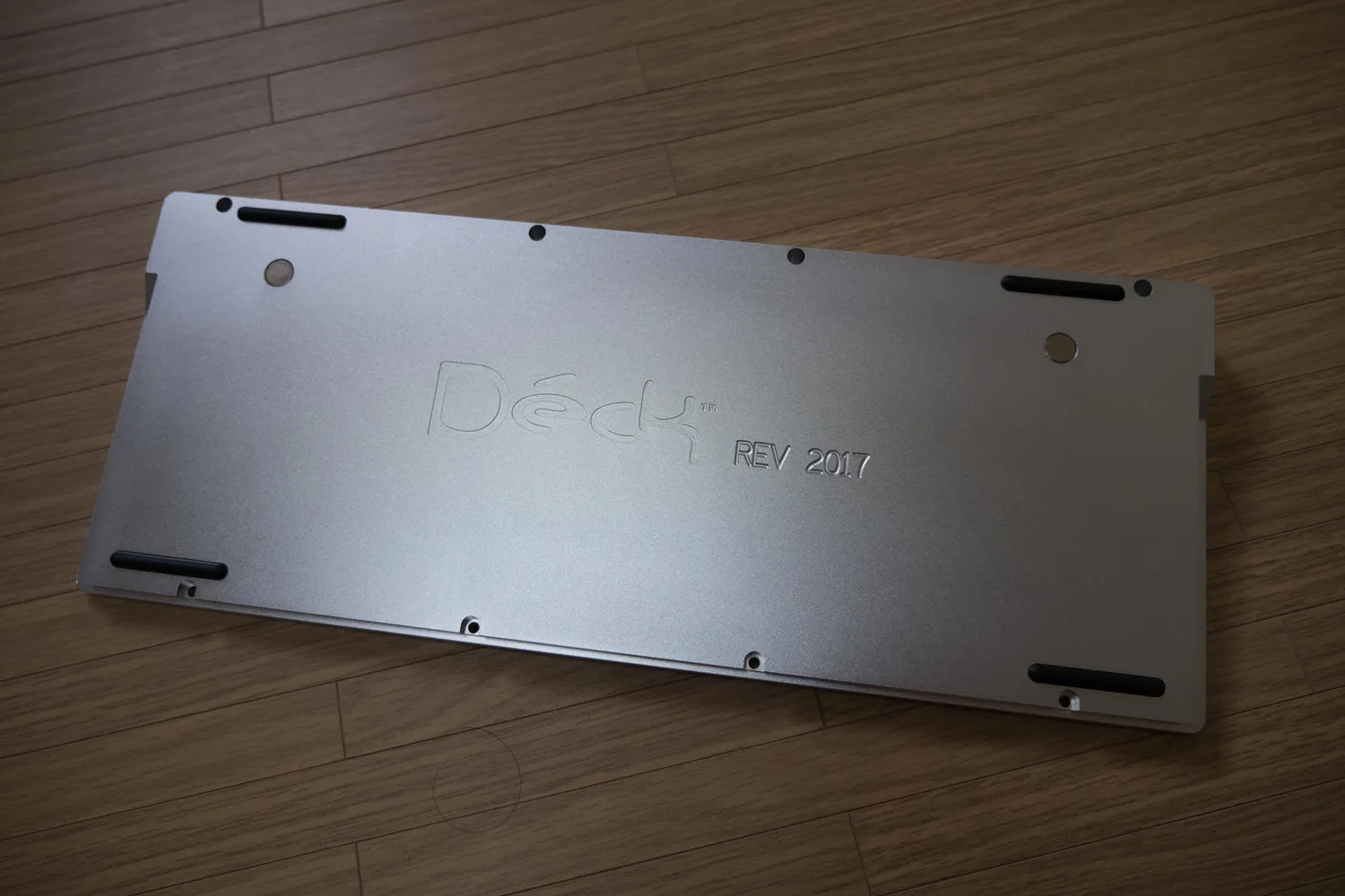 내부에는 키보드의 기판을 고정시키는 단자 구멍과 연결 케이블이 있고, 뒷면에는 아주 심플하게 "Deck REV 20107"이라는 문구와 키보드를 고정하기 위한 고무가 꽤나 크게 붙어 있고 별도로 구매한 높이 조절대를 붙일 수 있는 자석이 있다.