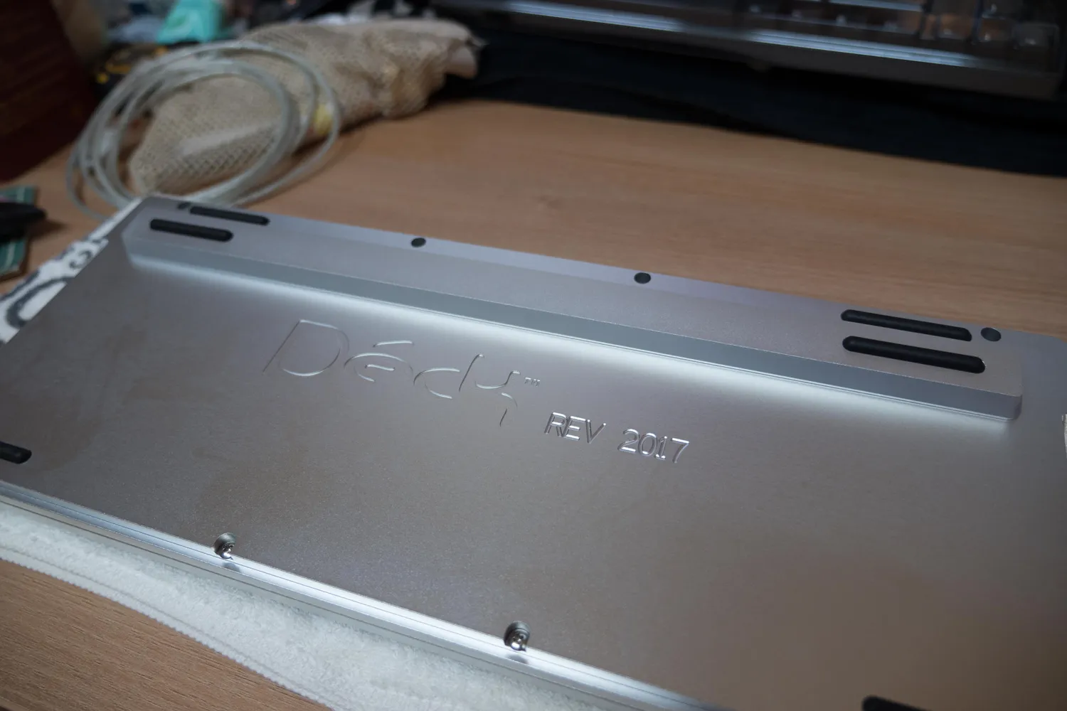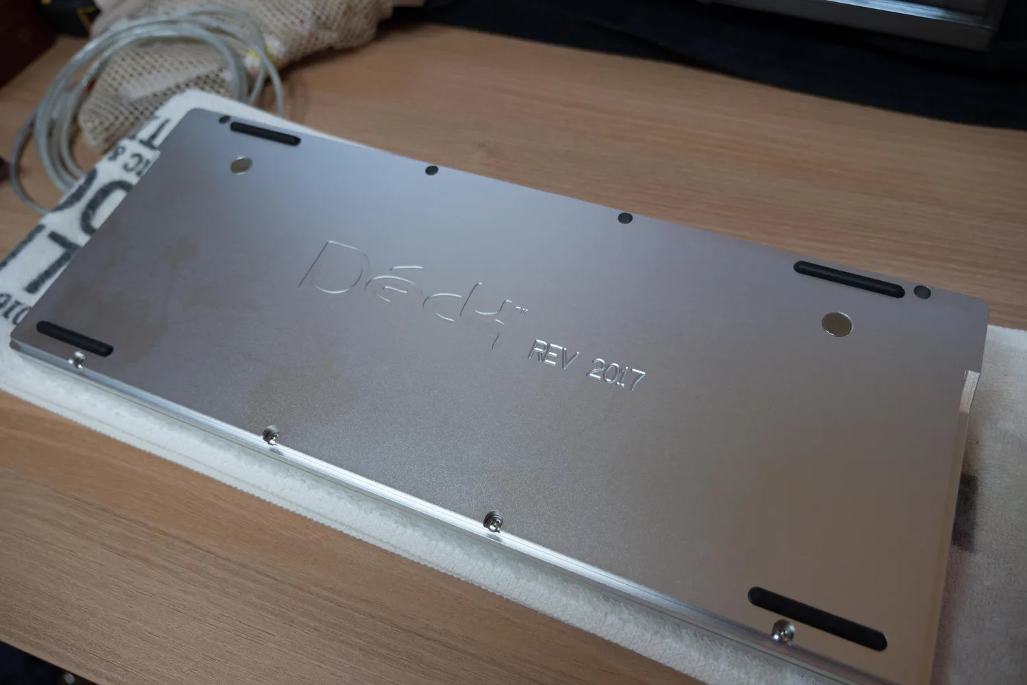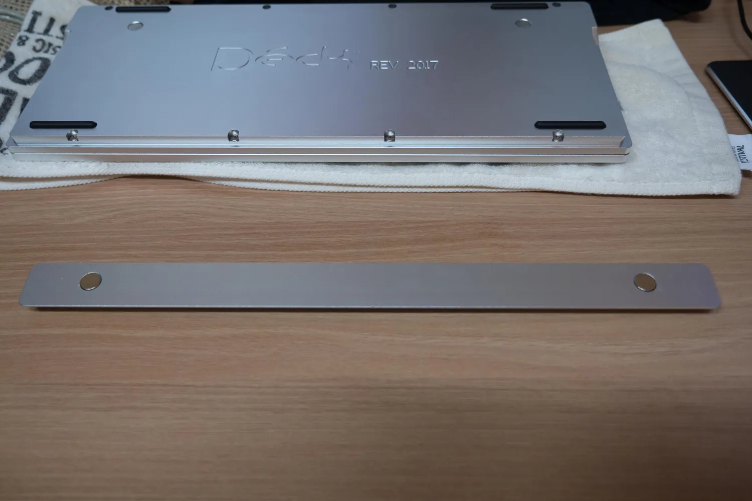 내부에는 키보드의 기판을 고정시키는 단자 구멍과 연결 케이블이 있고, 뒷면에는 아주 심플하게 "Deck REV 20107"이라는 문구와 키보드를 고정하기 위한 고무가 꽤나 크게 붙어 있고 별도로 구매한 높이 조절대를 붙일 수 있는 자석이 있다.