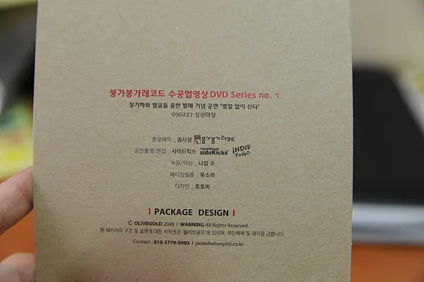 어쨋든 우리나라 음악시장에서 DVD를 만든다는건 거의 모험이 가깝다. 하지만 저렴간 가격(무려 만오천원!!)과 파격적인 패키지(?) 장기하와 얼굴들의 DVD는 우리곁에 오고야 말았다.