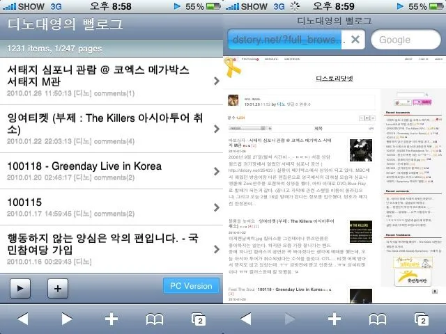 기본적으로 아이폰으로 내 블로그를 접속하면 왼쪽화면처럼 뜬다.