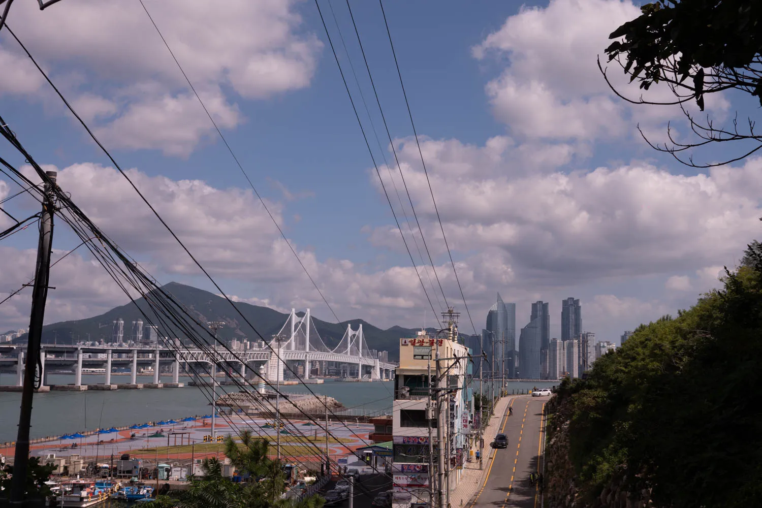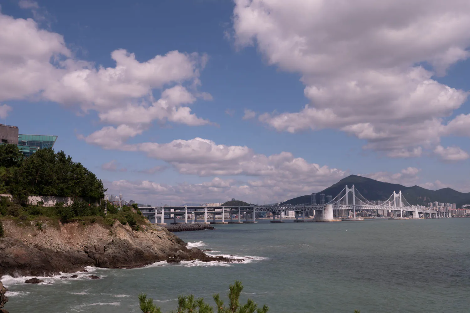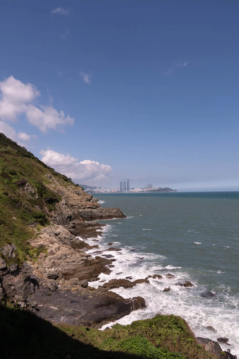 우리의 이기대 코스 시작점인데 이렇게 멋진 풍경이 펼쳐질 줄은 생각지 못 했다. 밤에 온다면 야경이 정말 멋질 것 같지만 수많은 전선이 많이 아쉽다. 날씨가 너무 좋다보니 막 찍어도 잘 담기는 날이다.