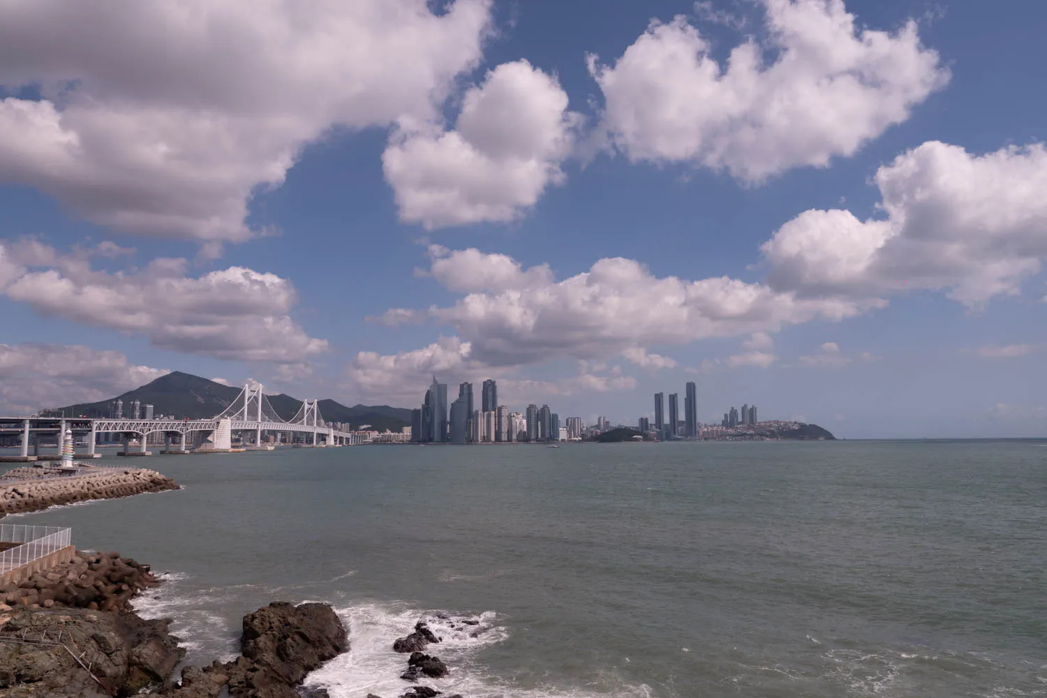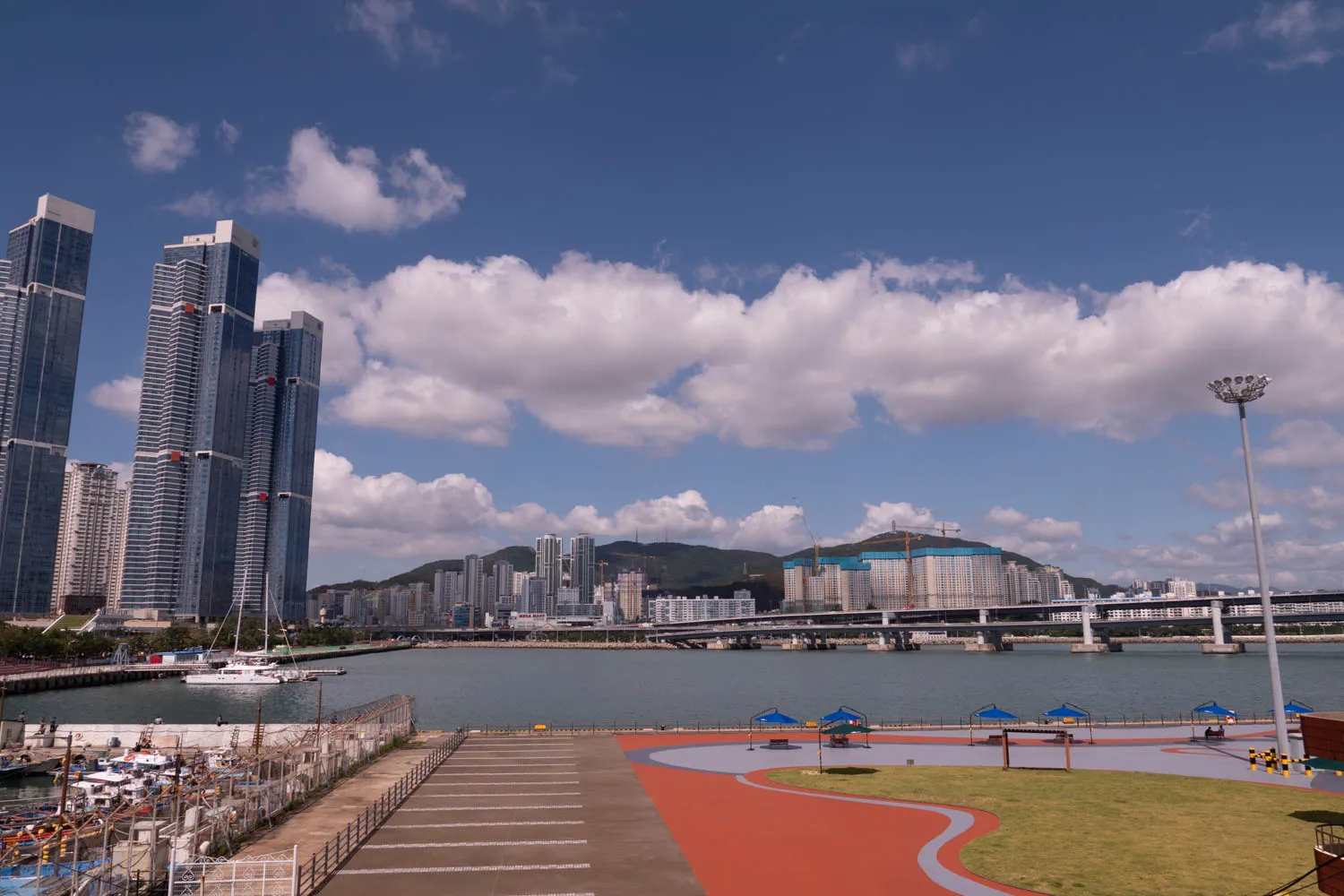수변공원인데 높은 건물이 있지만 하늘의 면적을 많이 덮지 않아서 좋았고 바다도 함께 볼 수 있다는 점이 휴식하기 좋은 장소다.