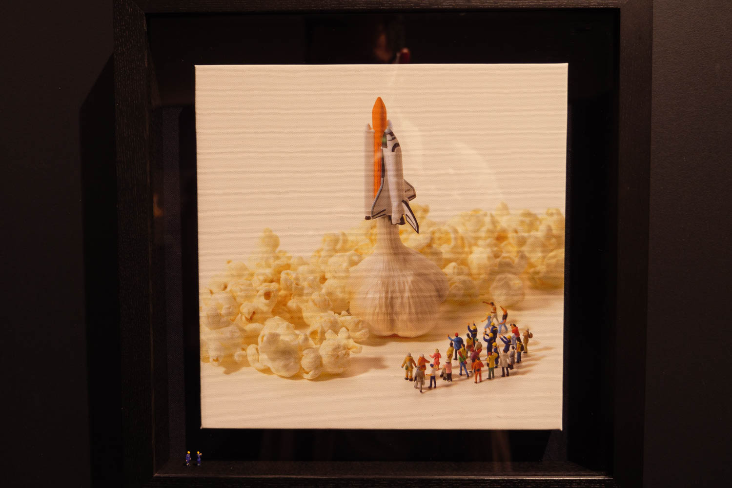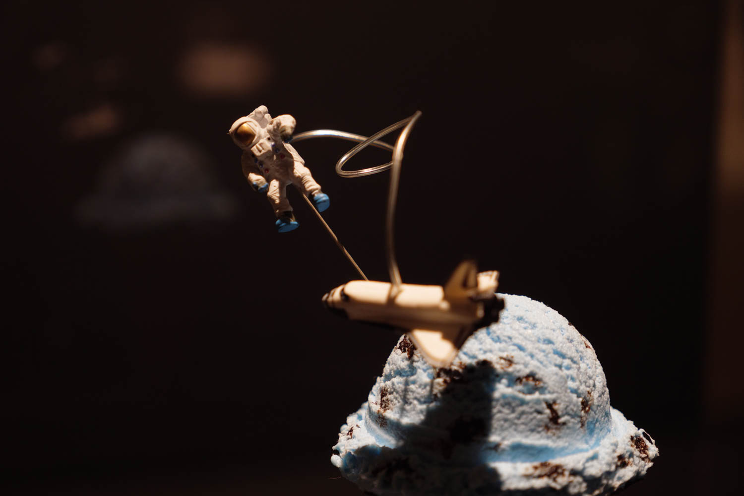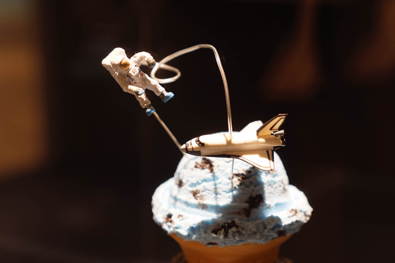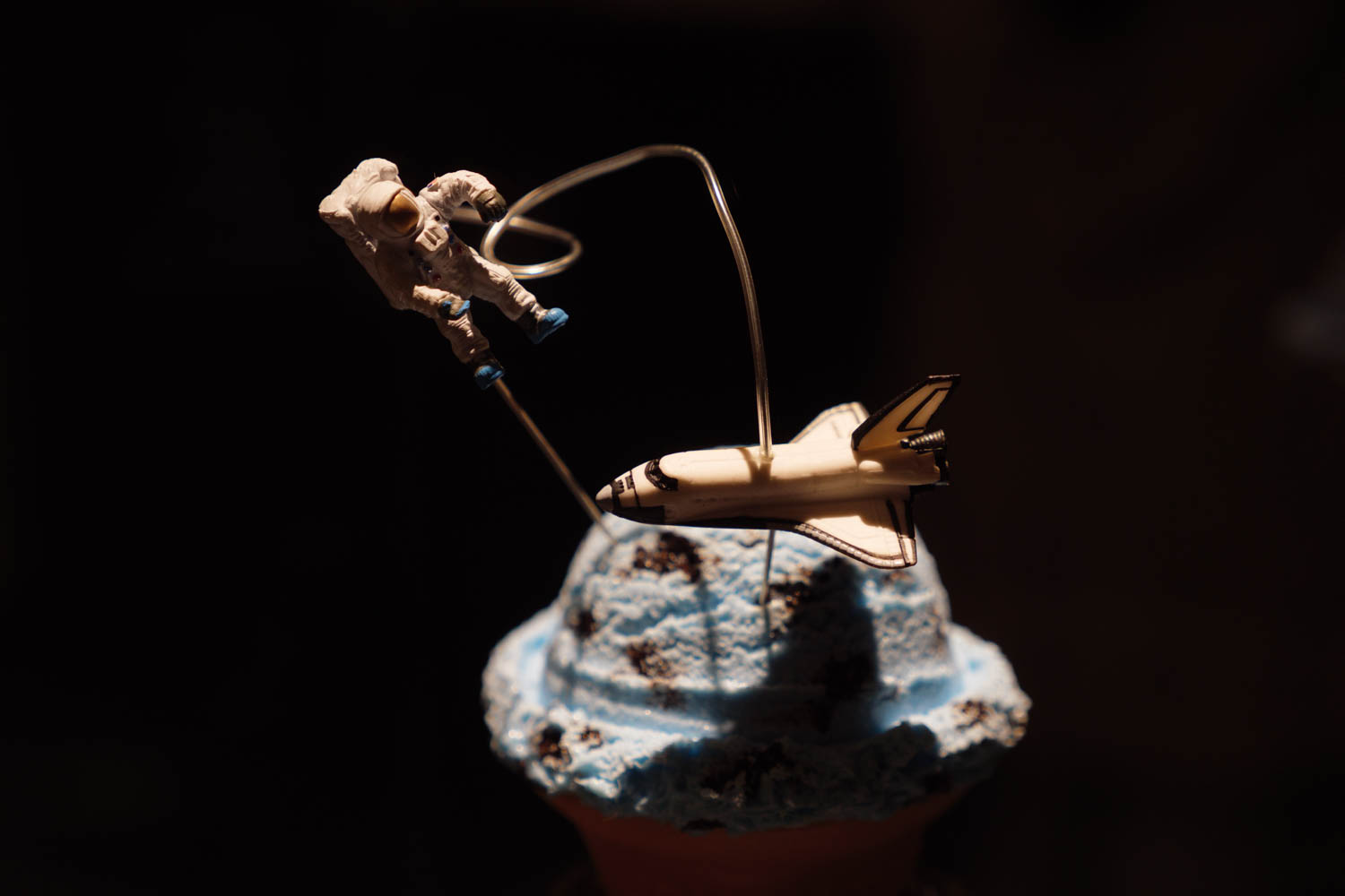 위에서 출발한 우주왕복선을 타가온 우주인이 유영을 하고 있다.