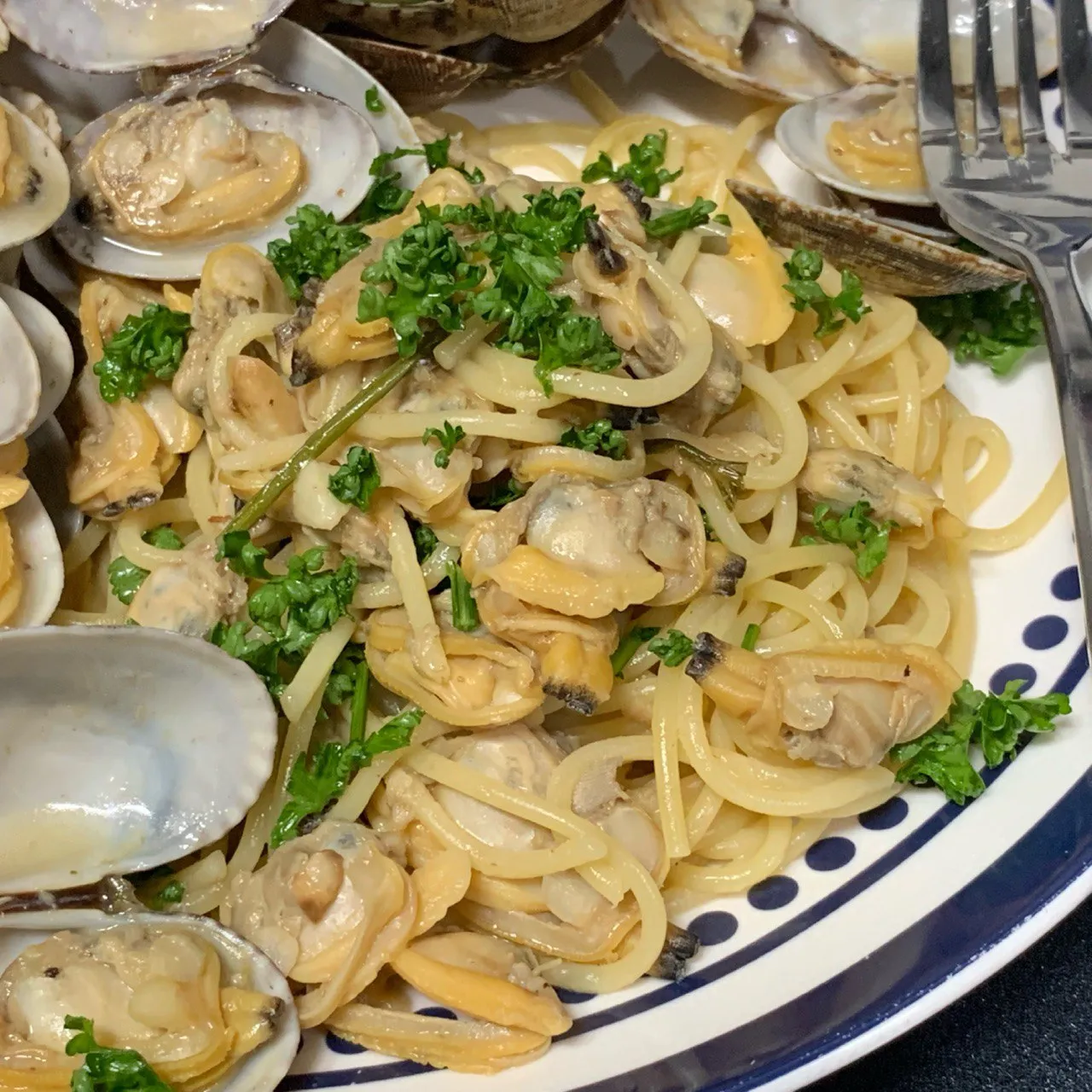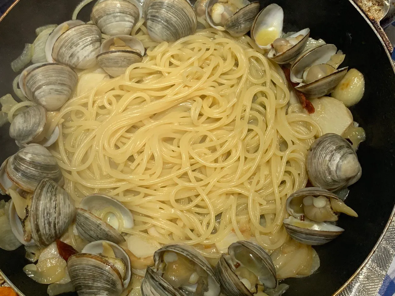 조리법은 간단하다. 올리브 유를 두른 팬에 마늘을 넣고 바지락 같은 조개류와 청하를 살짝 넣고 조리하면 조개의 개운한 냄새가 난다. 조개가 입을 뻐금 벌리면서 익기 시작하면 미리 뜨거운 물에 사우나 중인 면과 면수 약간을 넣은 후 조금더 조리해주면 끝.
