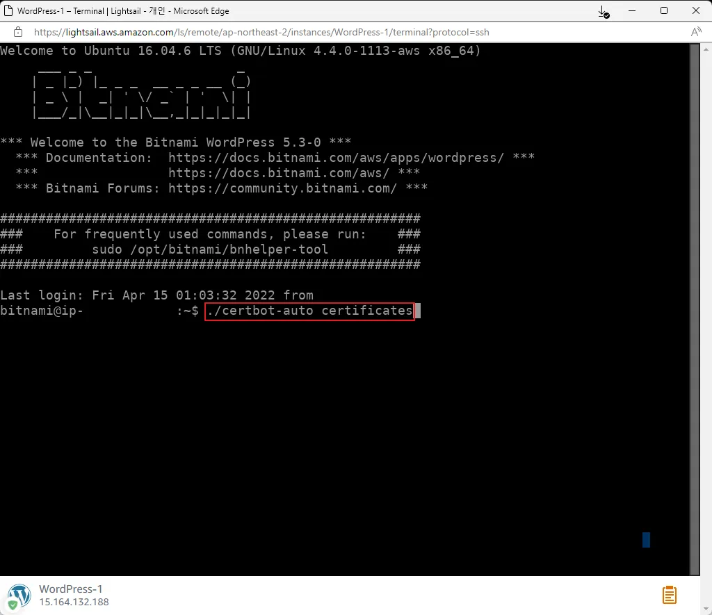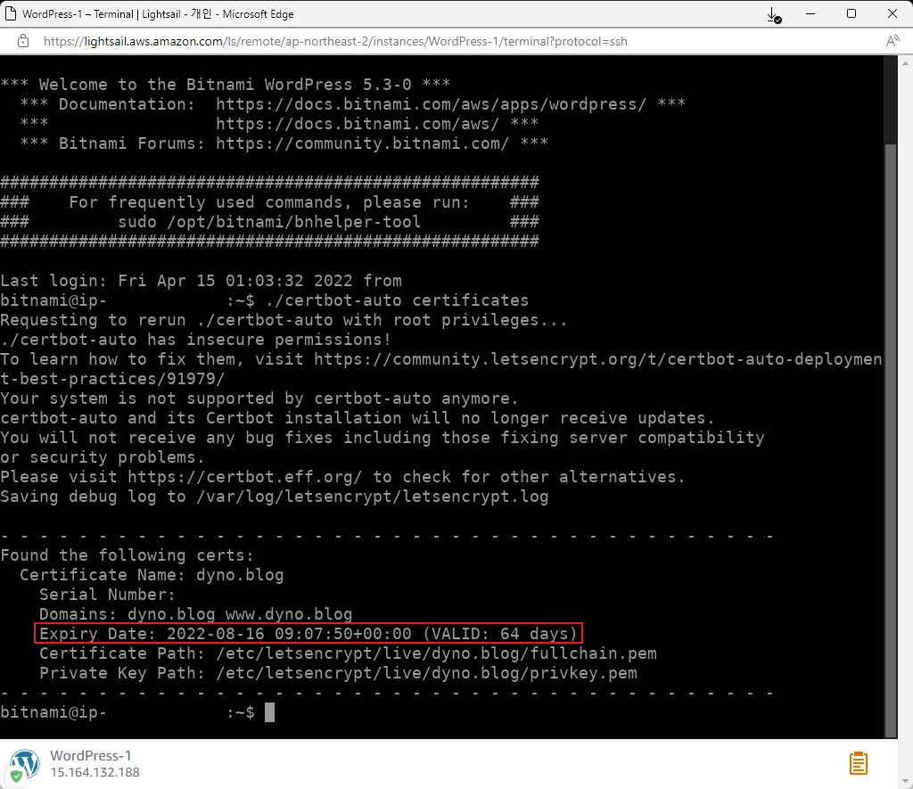 이 블로그는 AWS(아마존 웹 서비스)의 lightsail(라이트세일)이라는 상품을 통해 운용하고 있다. 라이트세일에서 운영하기 위해서는 SSL를 별도로 발급받아야 하는데 Let’s Encrypt라는 기관을 이용하면 무료로 사용할 수 있다.
