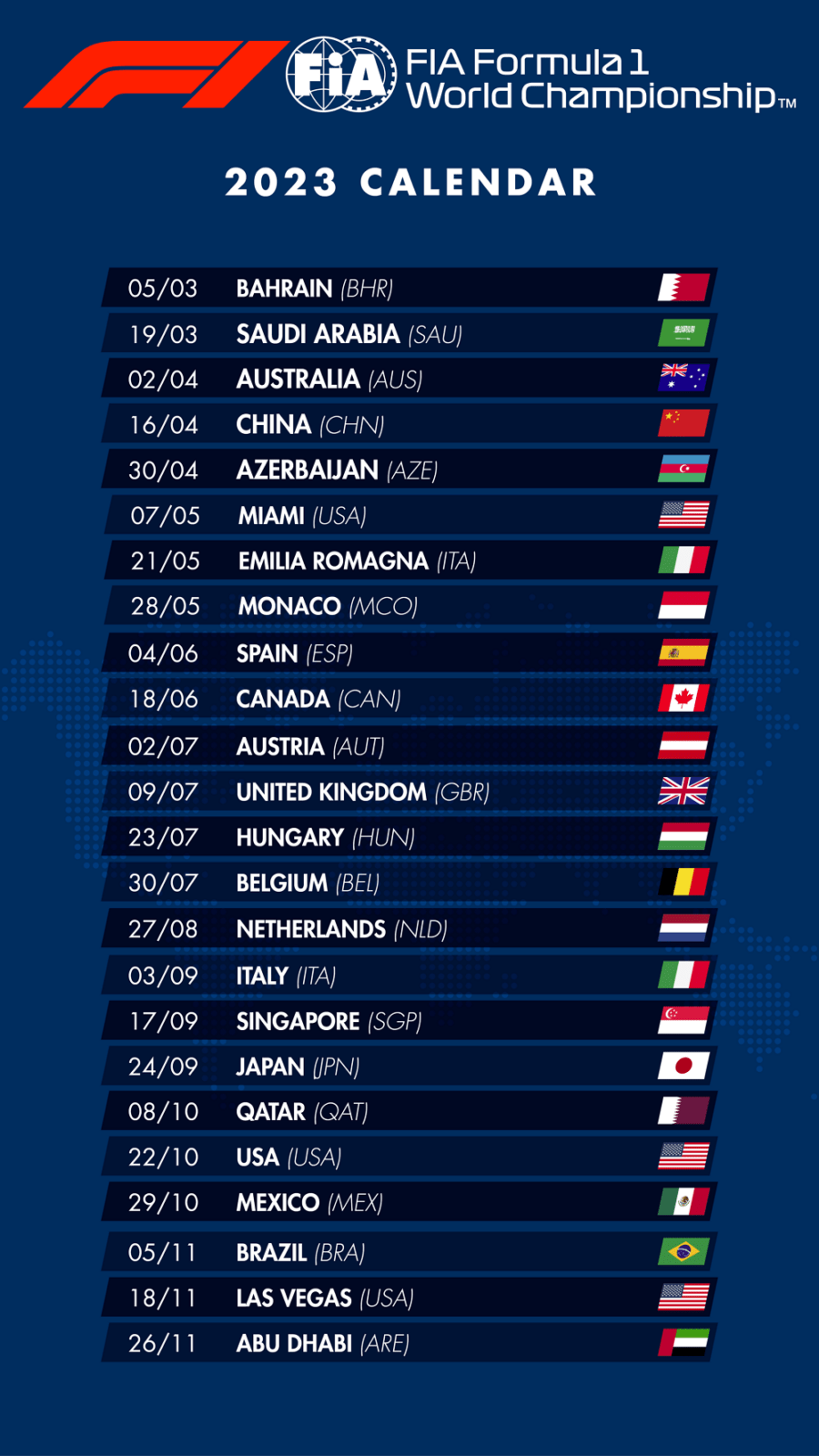 2023년 F1 그랑프리가 벌써 2개월 앞으로 다가왔다. 드라이버 라인업도 모두 나왔고 이제 F1 차량 공개 정도가 큰 이슈로 남아 있다. 2월 부터 공개하기 시작해서 그달 말 프리시즌 테스트를 통해 대략적인 성능이 공개될 것이다. 이쯤에서 F1 그랑프리 일정을 정리해서 올려본다.