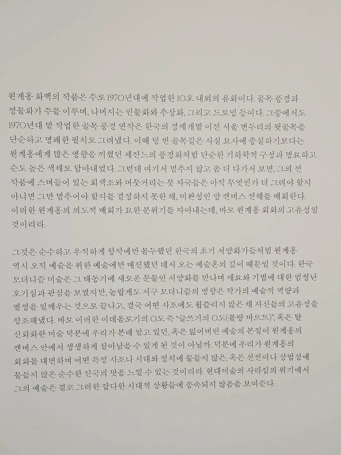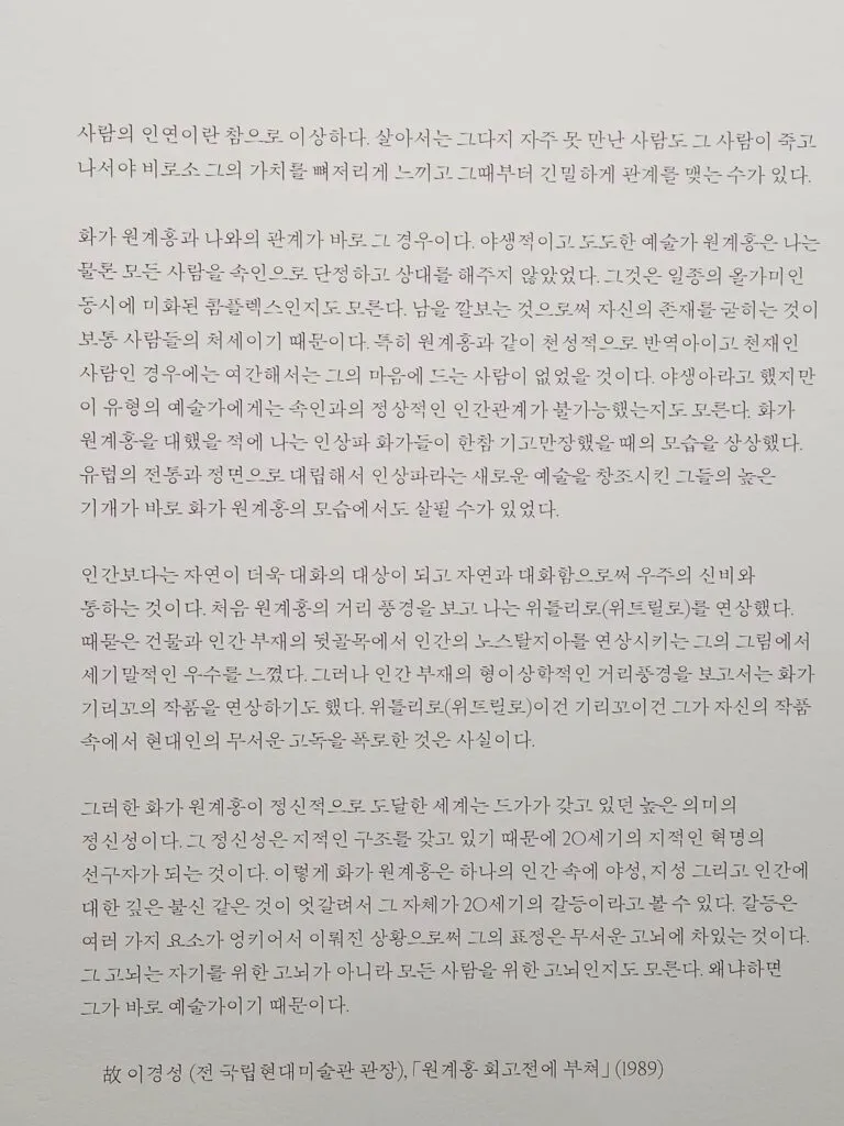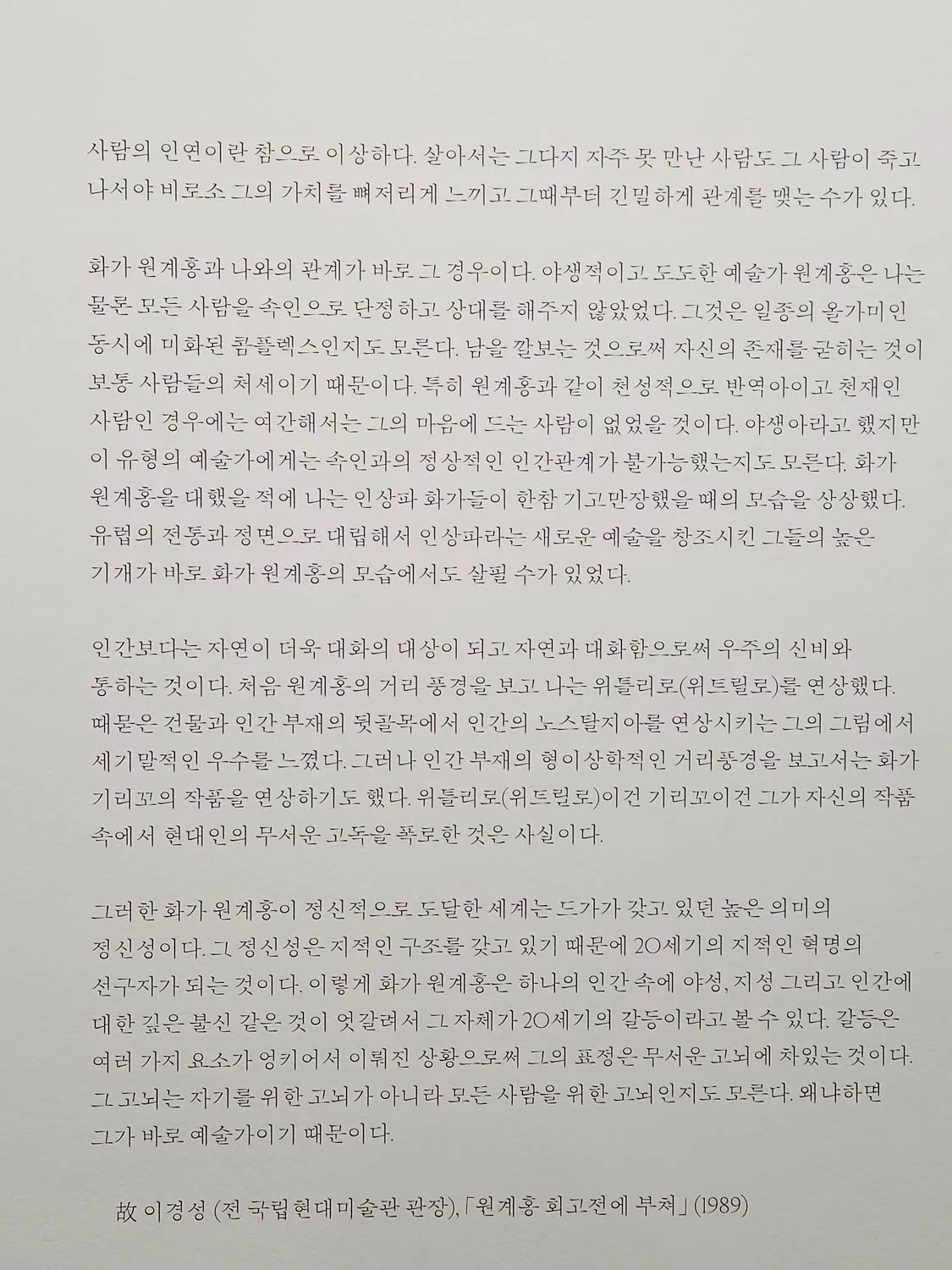 - 故 이경성 (전 국립현대미술관 관장), 「원계홍 회고전에 부쳐」 (1989)