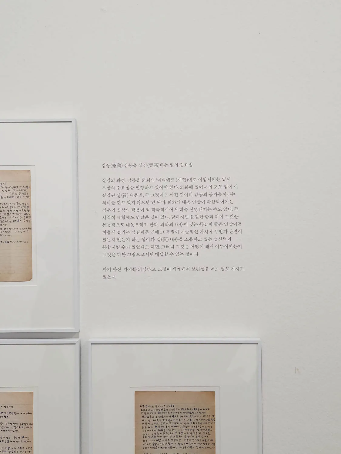 실감의 과정. 감동을 회화의 '마티에르'(재질)에로 이입시키는 일에 무상의 중요성을 인정하고 있어야 한다. 회화에 있어서의 모든 점이 이 실감된 질(質) 내용을, 즉 그것이 느껴진 것이며 감동의 등가물이라는 의미를 갖고 있지 않으면 안 된다. 회화의 내용 인상이 확산되어가는 경우와 심상의 작용이 퍽 적극적이어서 더욱 선명해지는 수도 있다. 즉 시각적 체험에도 언짢은 것이 있다. 말하자면 불길한 꿈과 같이 그것을 본능적으로 내쫓으려고 한다. 회화의 내용이 갖는 특질이 좋은 인상이든 마음에 걸리는 성질이든 간에 그 특질이 예술적인 가치에 무언가 관련이 있는지 없는지 하는 점이다. 질(質) 내용을 소유하고 있는 정신력과 통합시킬 수가 있었다고 하면, 그러나 그것은 어떻게 해서 이루어지는지 그것은 다만 그림으로서만 대답할 수 있는 것이다.