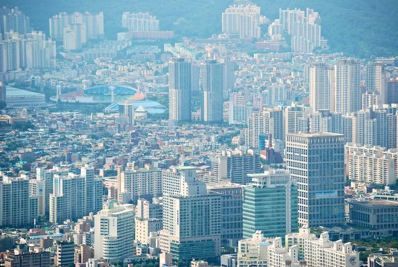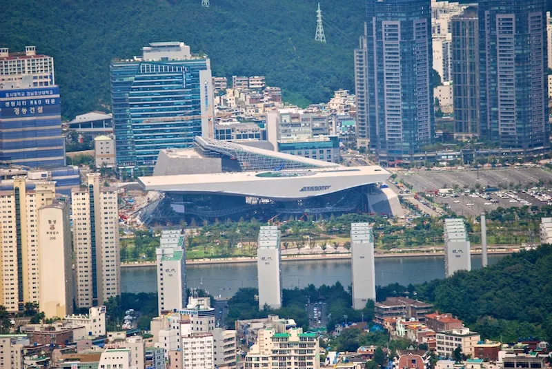 부산 시청과 저 멀리 보이는 사직 야구장.
