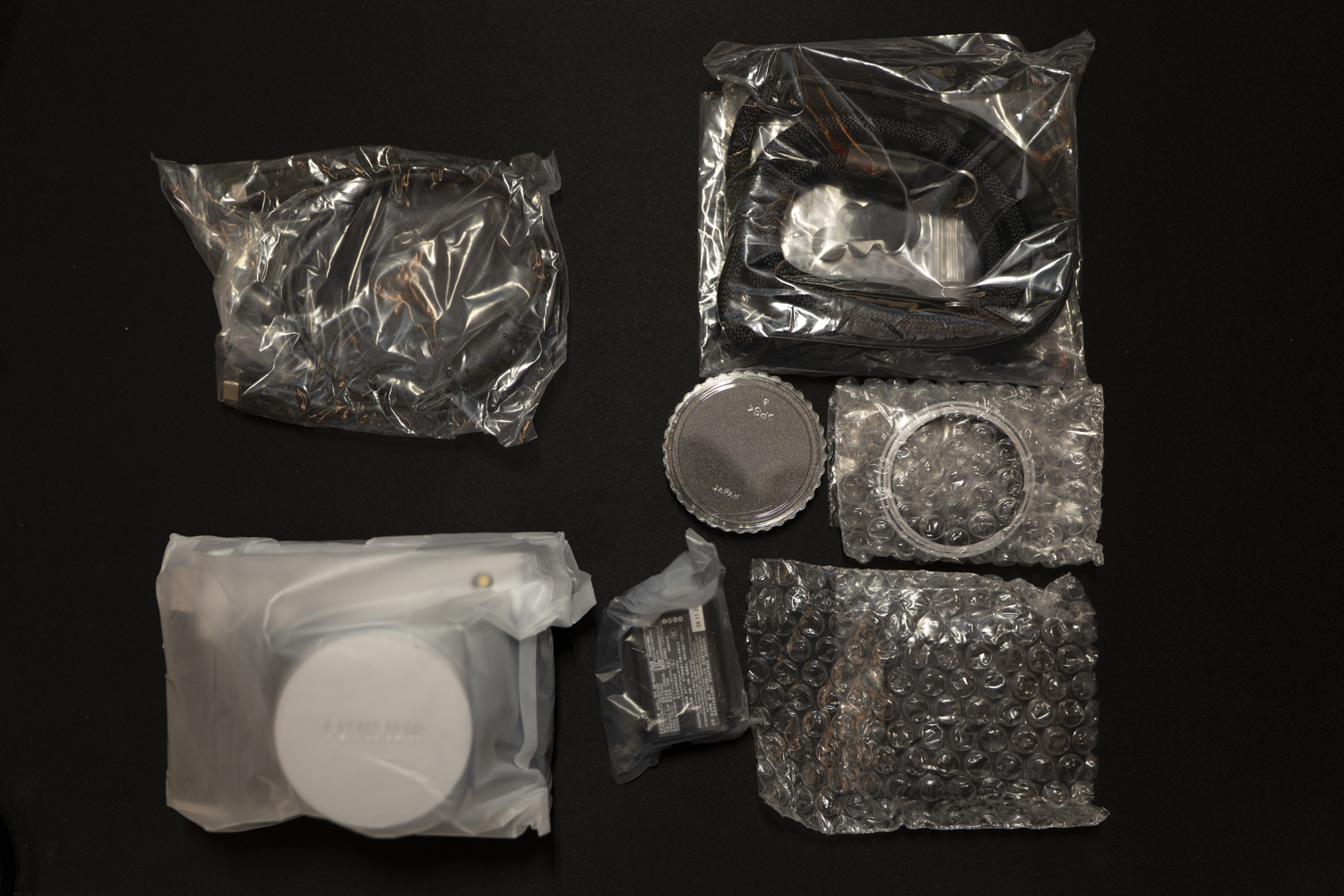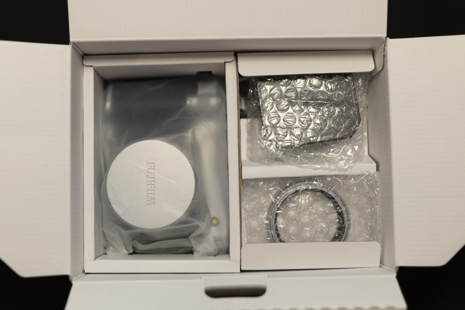 다음 칸에 바로 카메라와 여러 악세사리가 보인다. 이번 패키지의 장점이라면 필터와 좋은 퀄리티의 스트랩을 준다는 것이다. 여기서 후지필름이 고려한 고객 타겟을 알 수 있다. 중형이지만 콤팩트 형태로서 아마추어 사진 작가를 위함임을 알 수 있다.