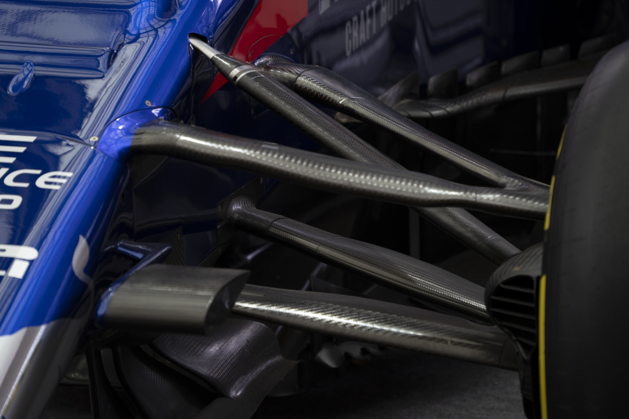 서스펜션. 레이스 도중 차량끼리 충돌하거나 벽과 부딪혔을 때 부러지는 경우를 종종 본다. 카본으로 만들어져있는 것을 볼 수 있다.