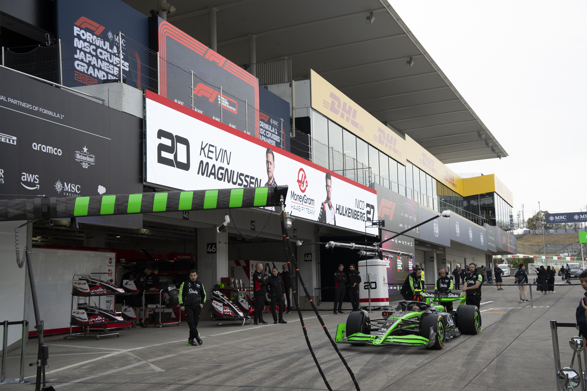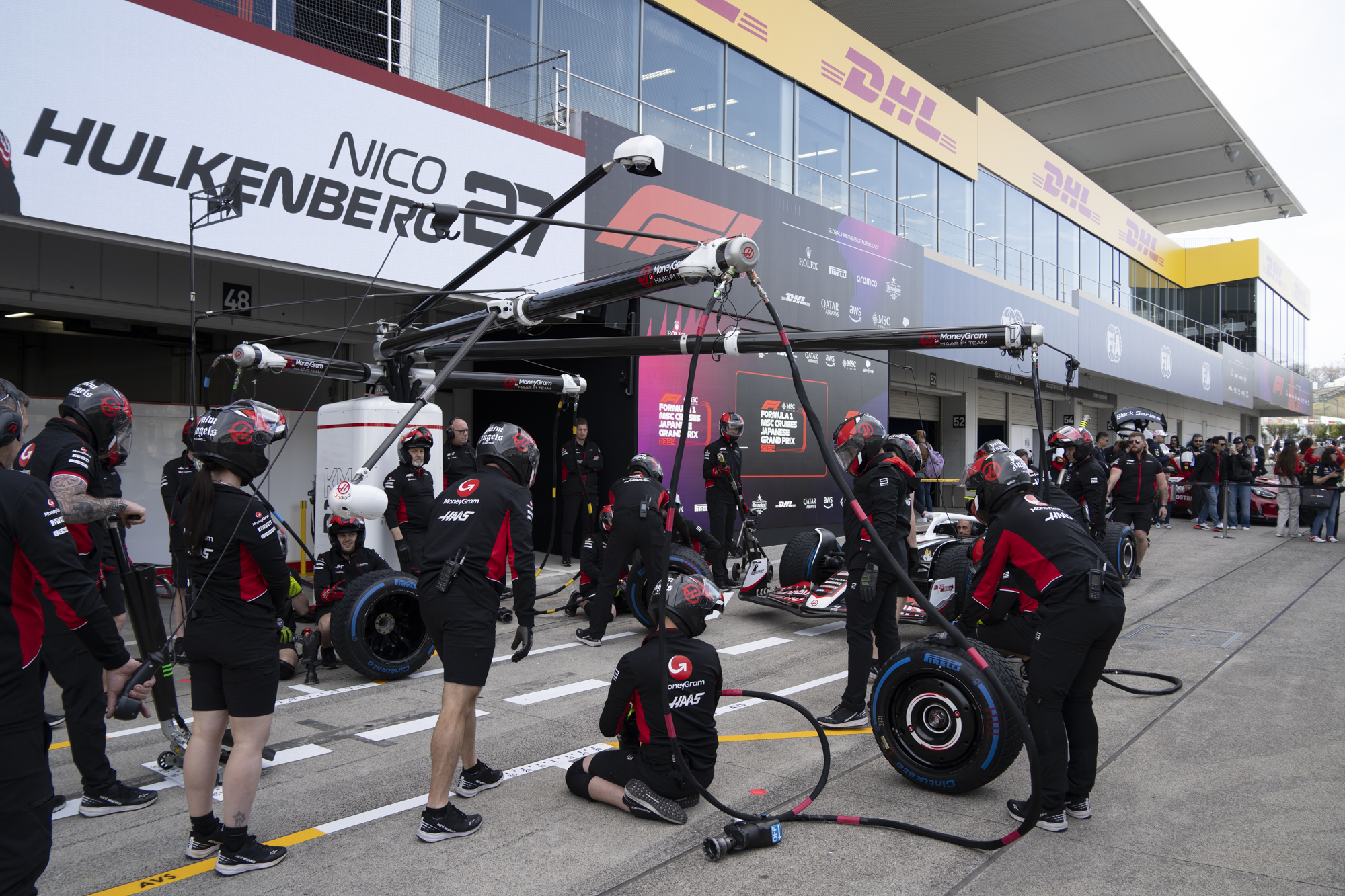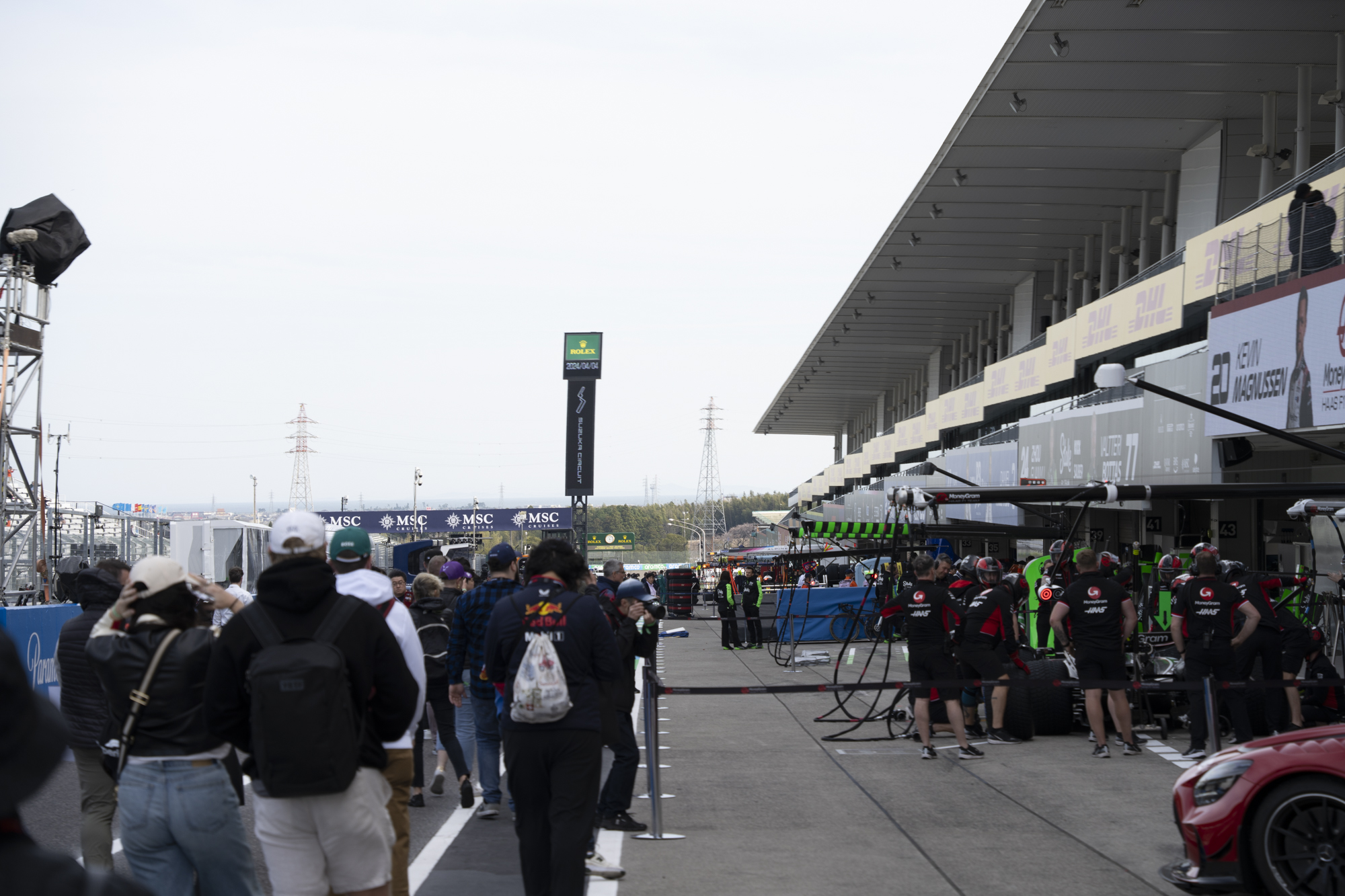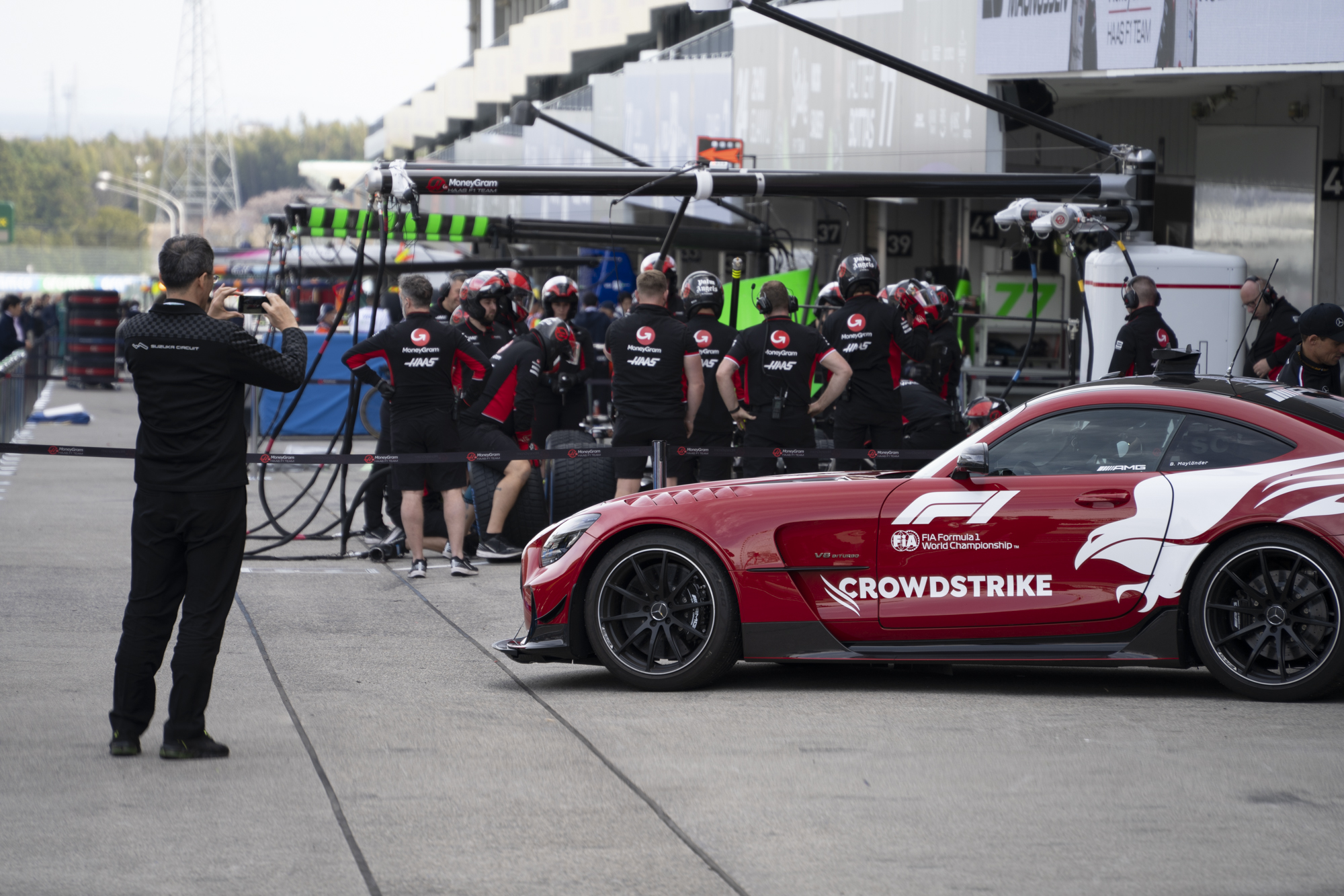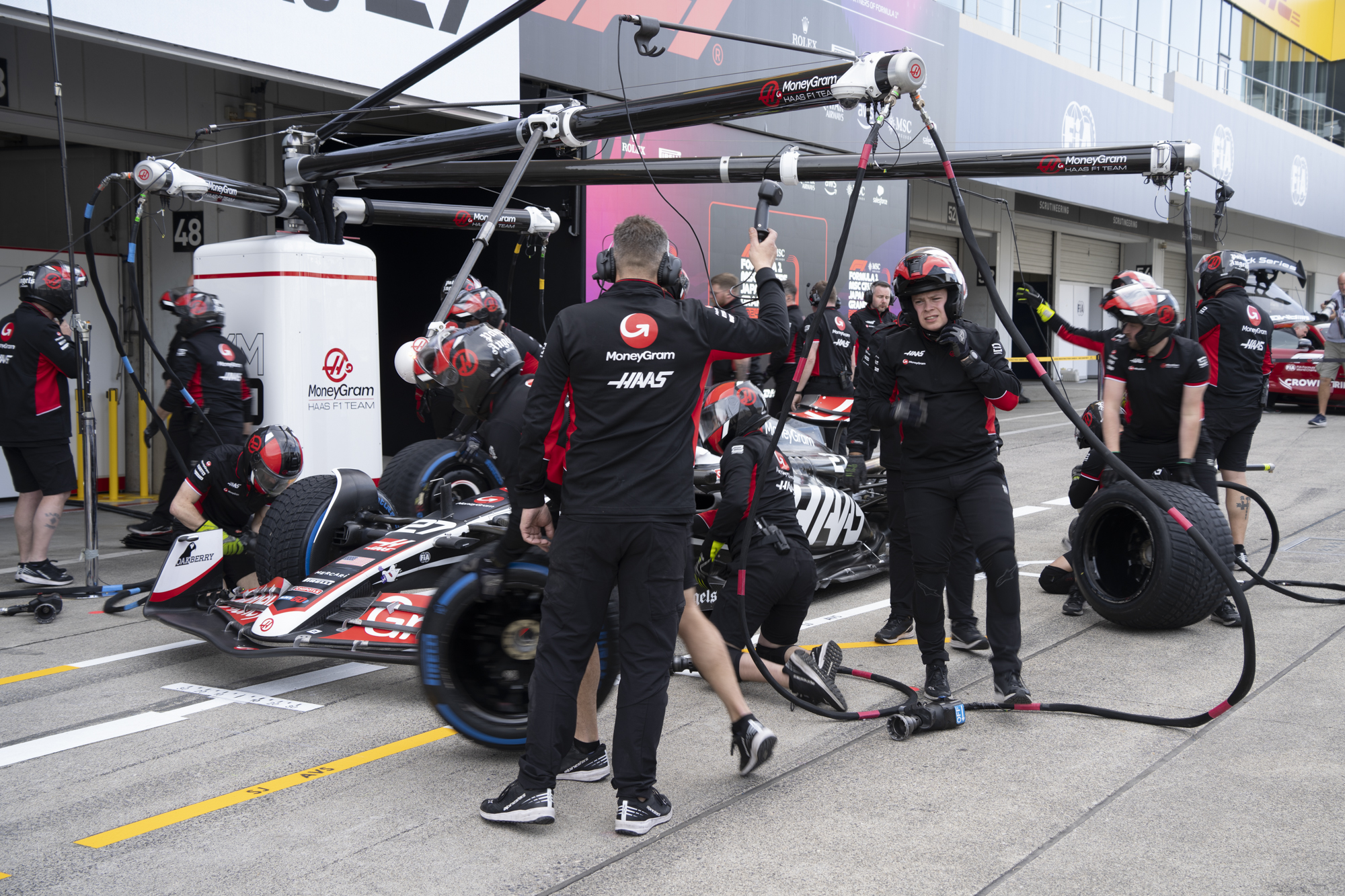 세이프티카와 하스팀의 핏크루들이 관람객들에게 보여줄 겸 연습 겸 타이어 교체를 하기 위해 대기하고 있다.