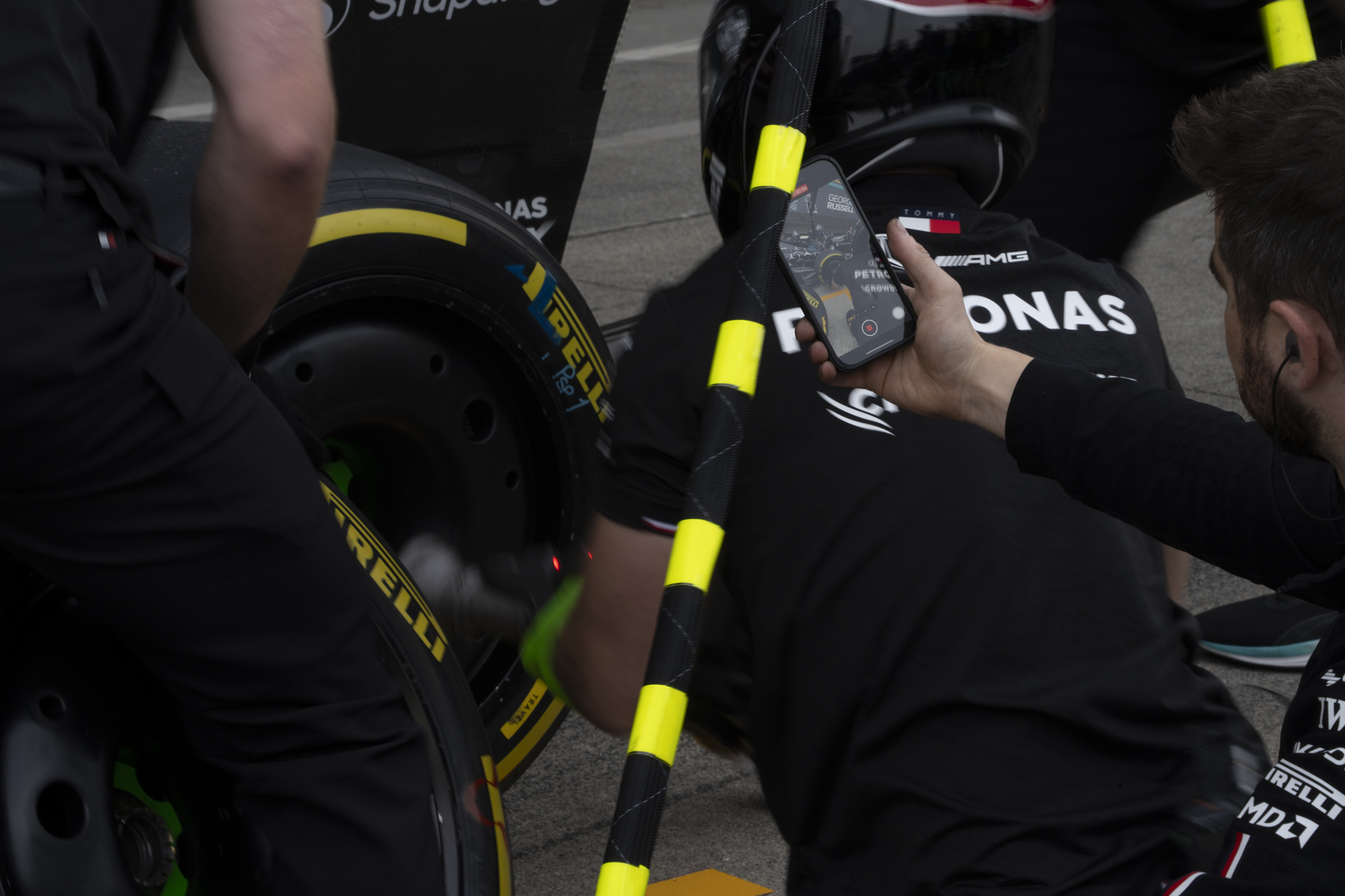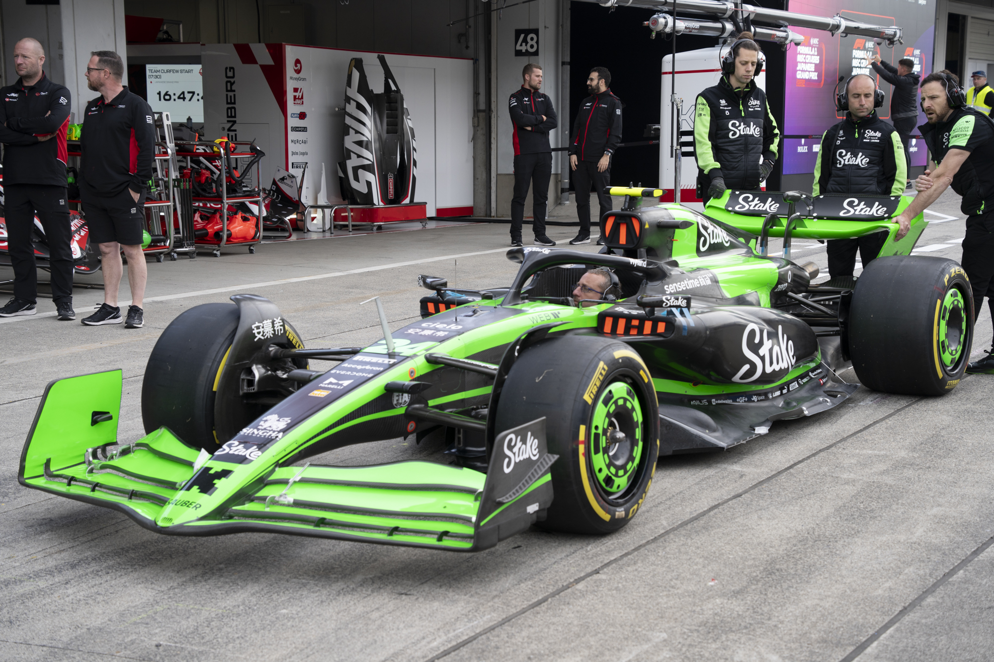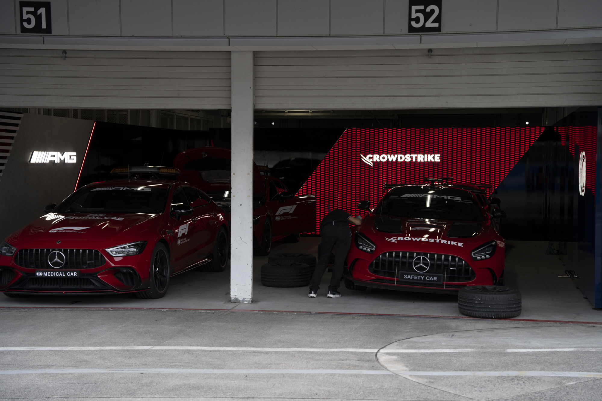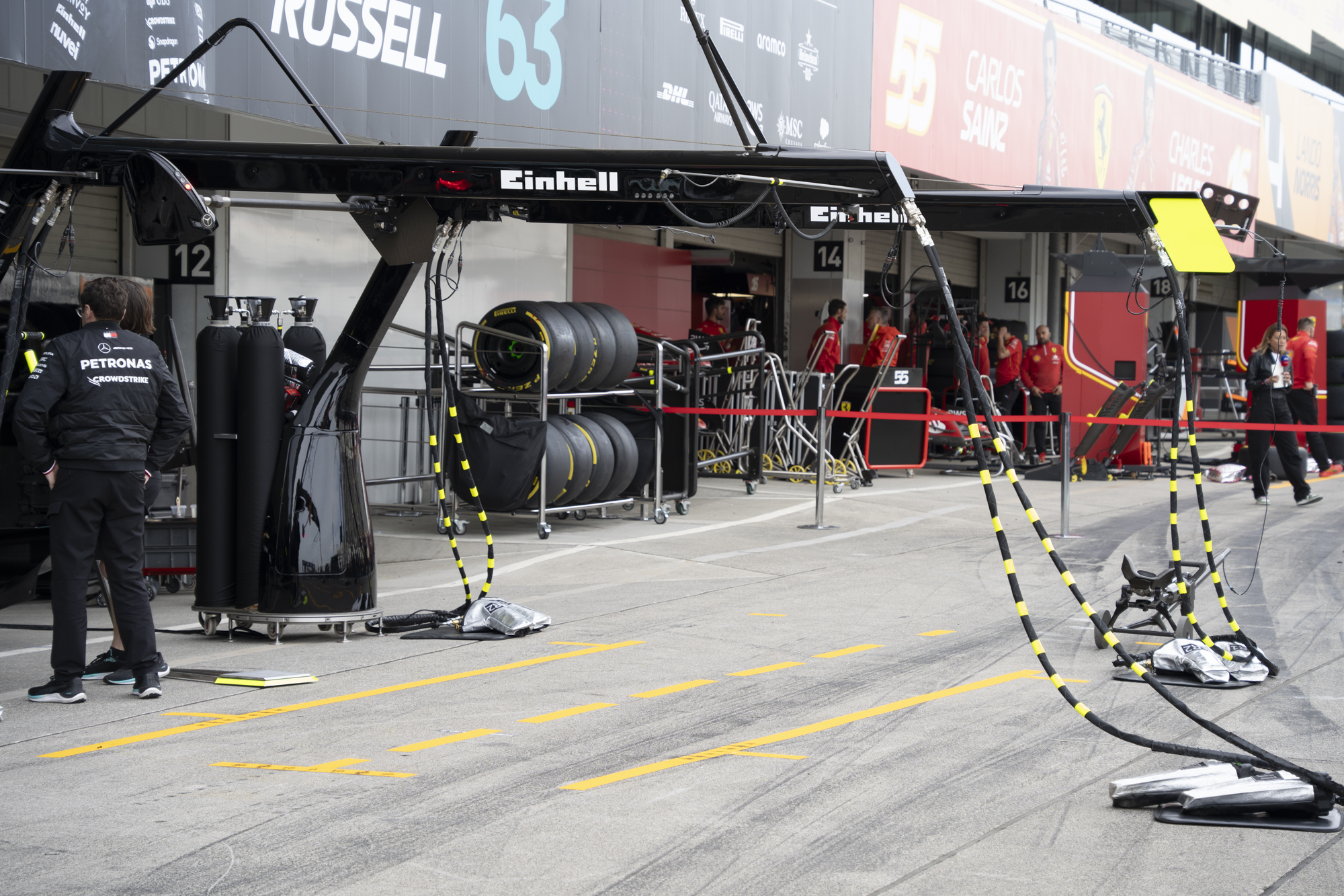 세이프티카와 하스팀의 핏크루들이 관람객들에게 보여줄 겸 연습 겸 타이어 교체를 하기 위해 대기하고 있다.