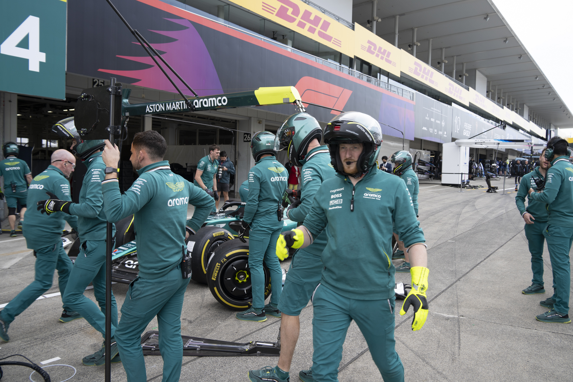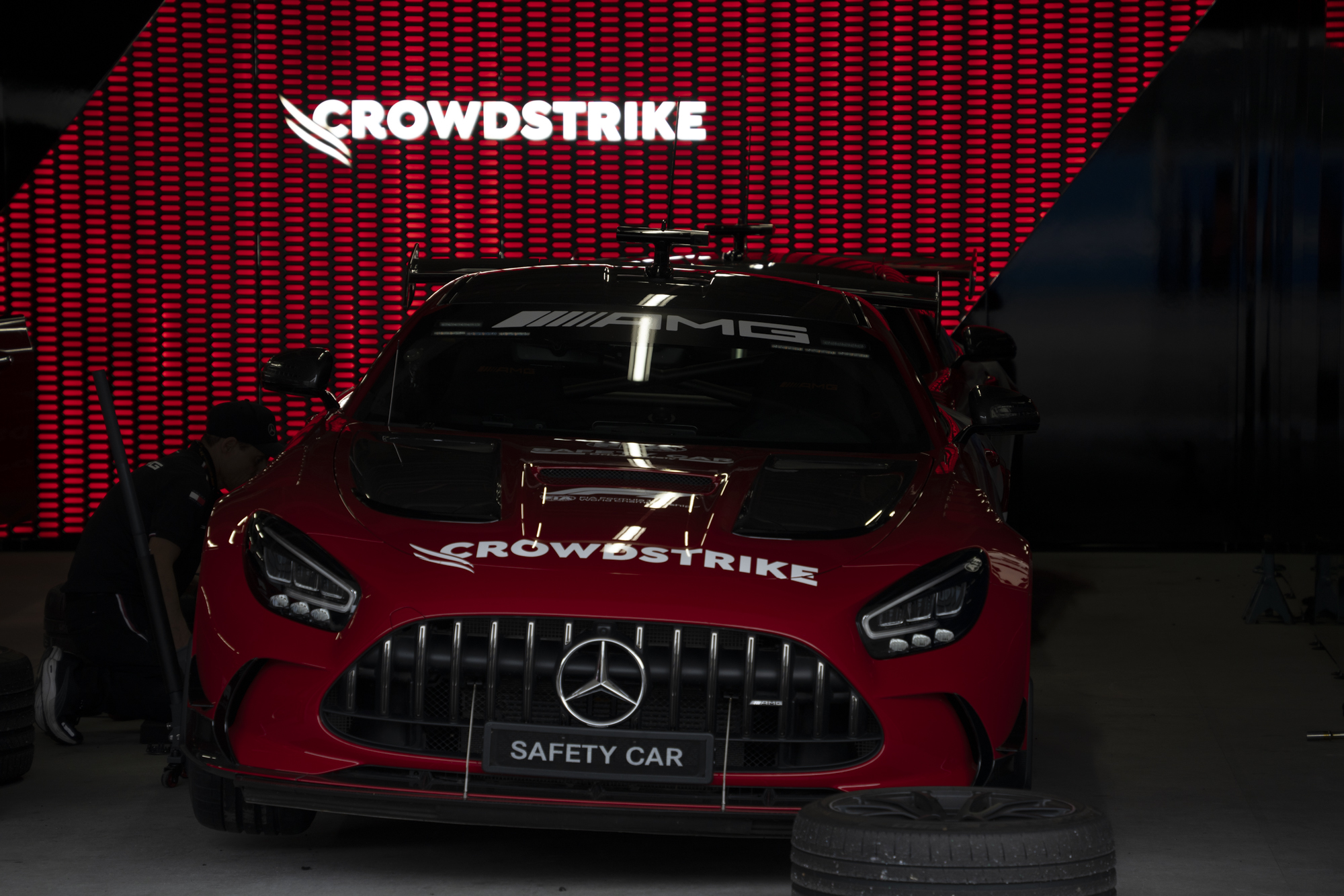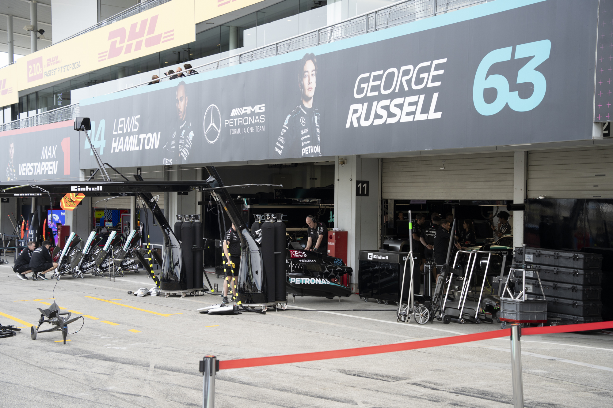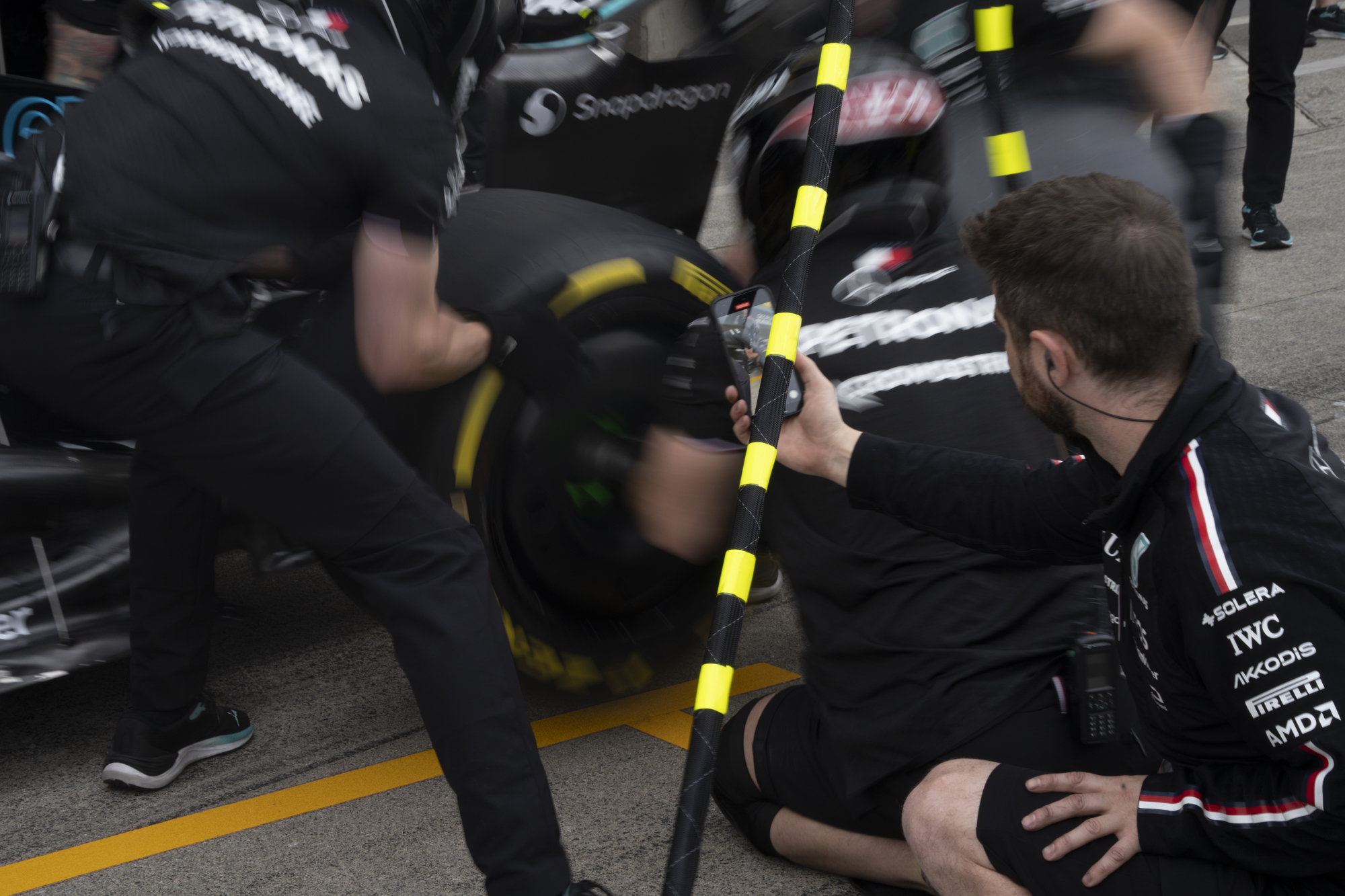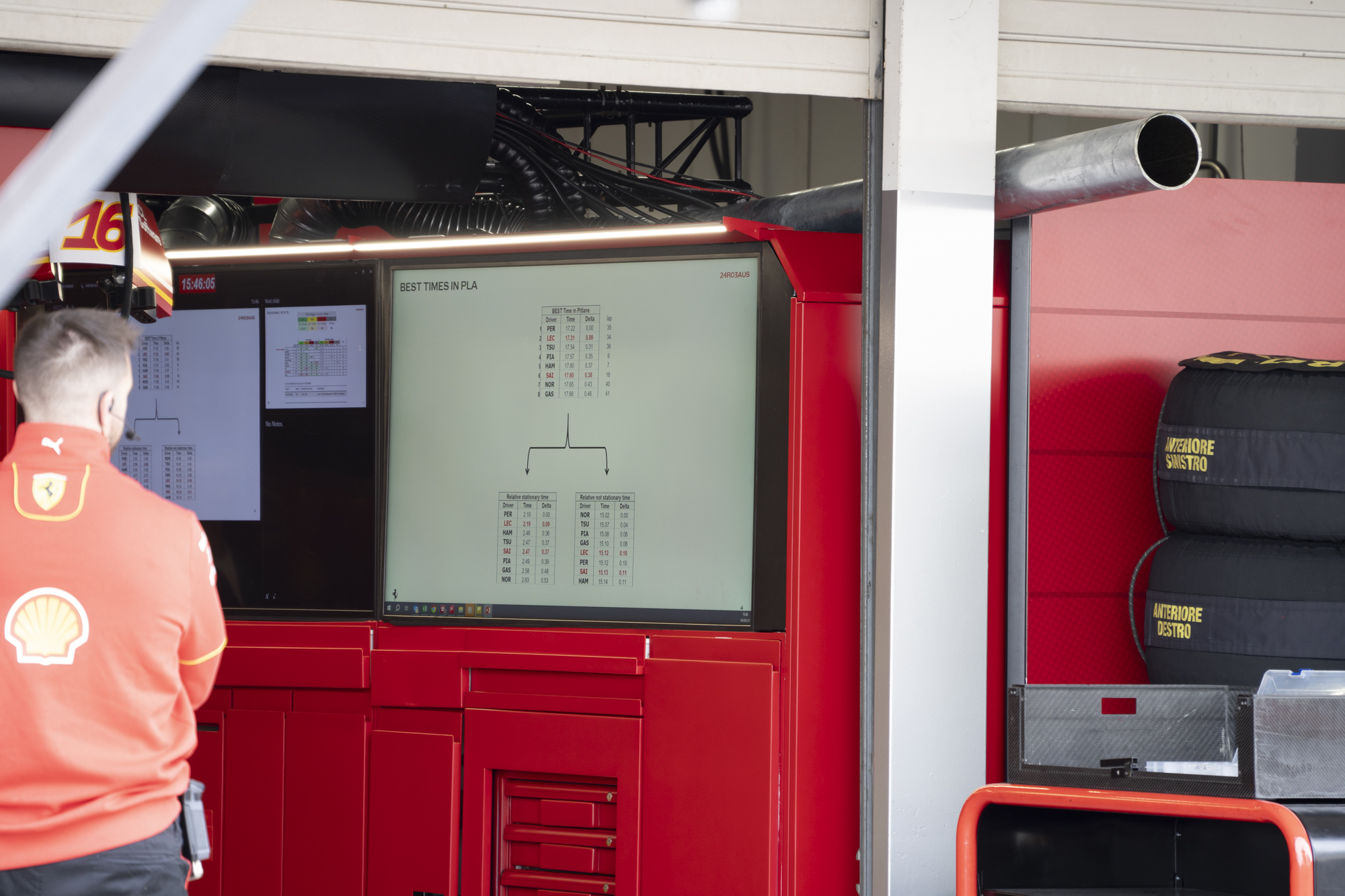 세이프티카와 하스팀의 핏크루들이 관람객들에게 보여줄 겸 연습 겸 타이어 교체를 하기 위해 대기하고 있다.