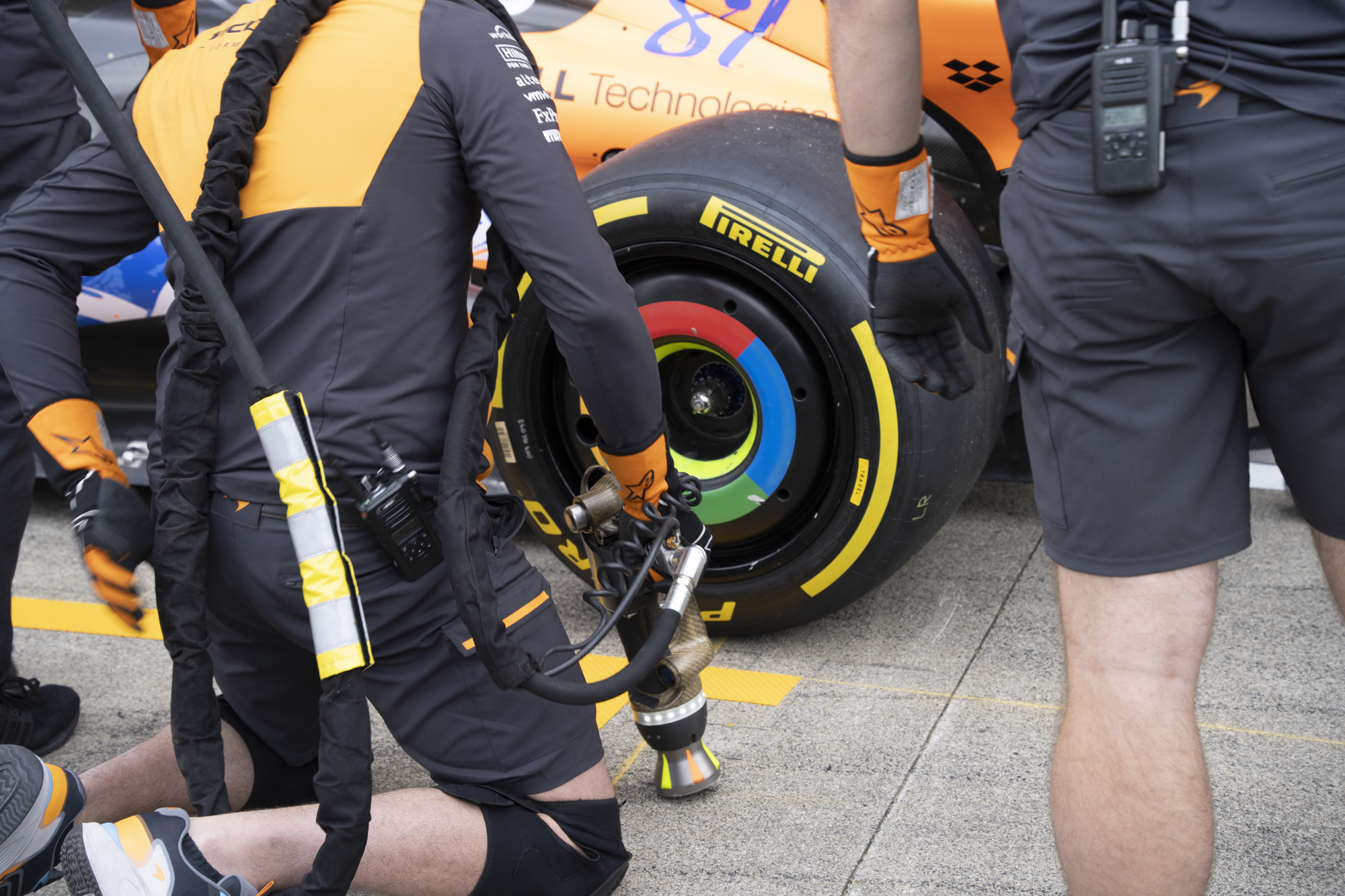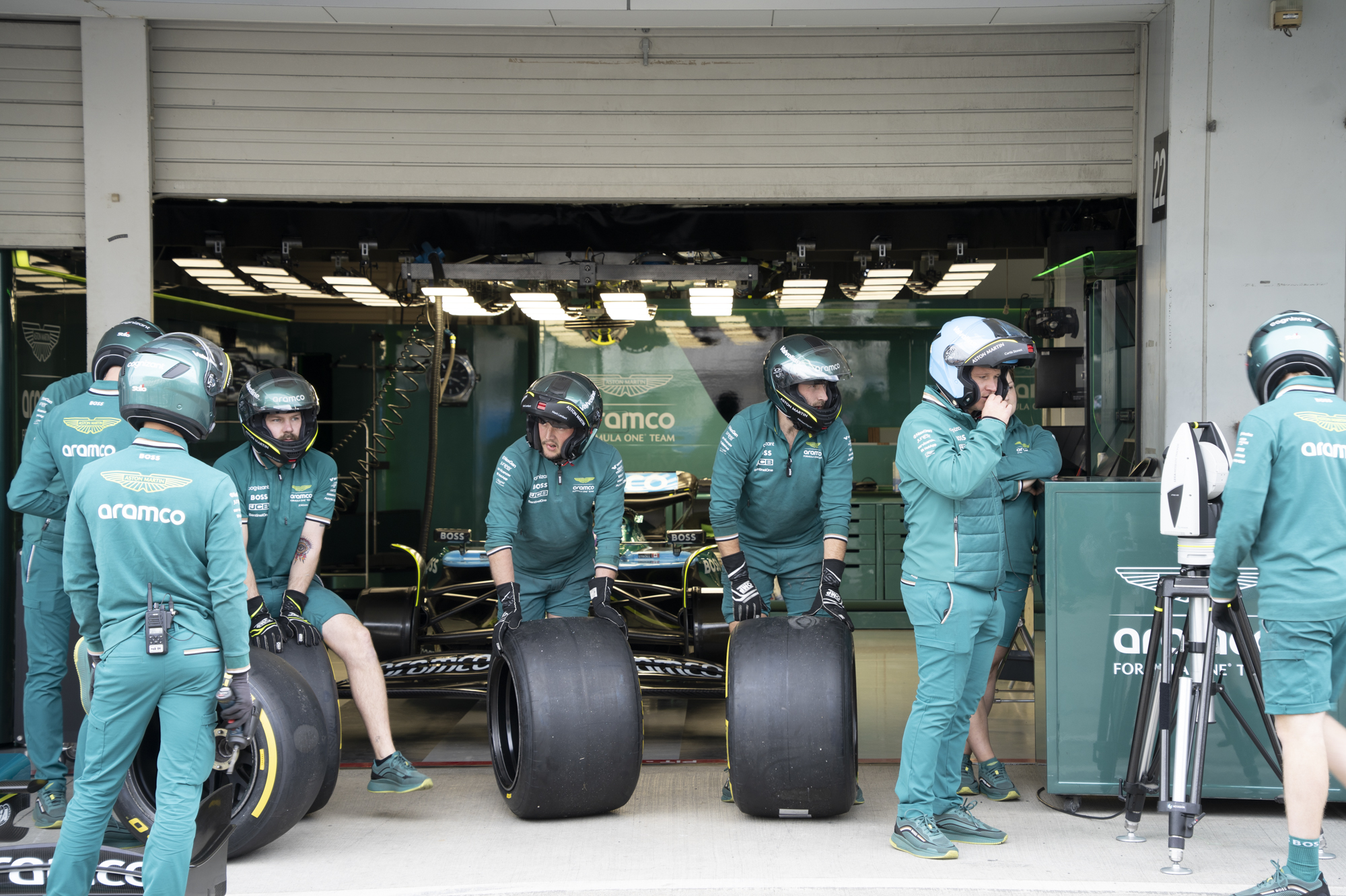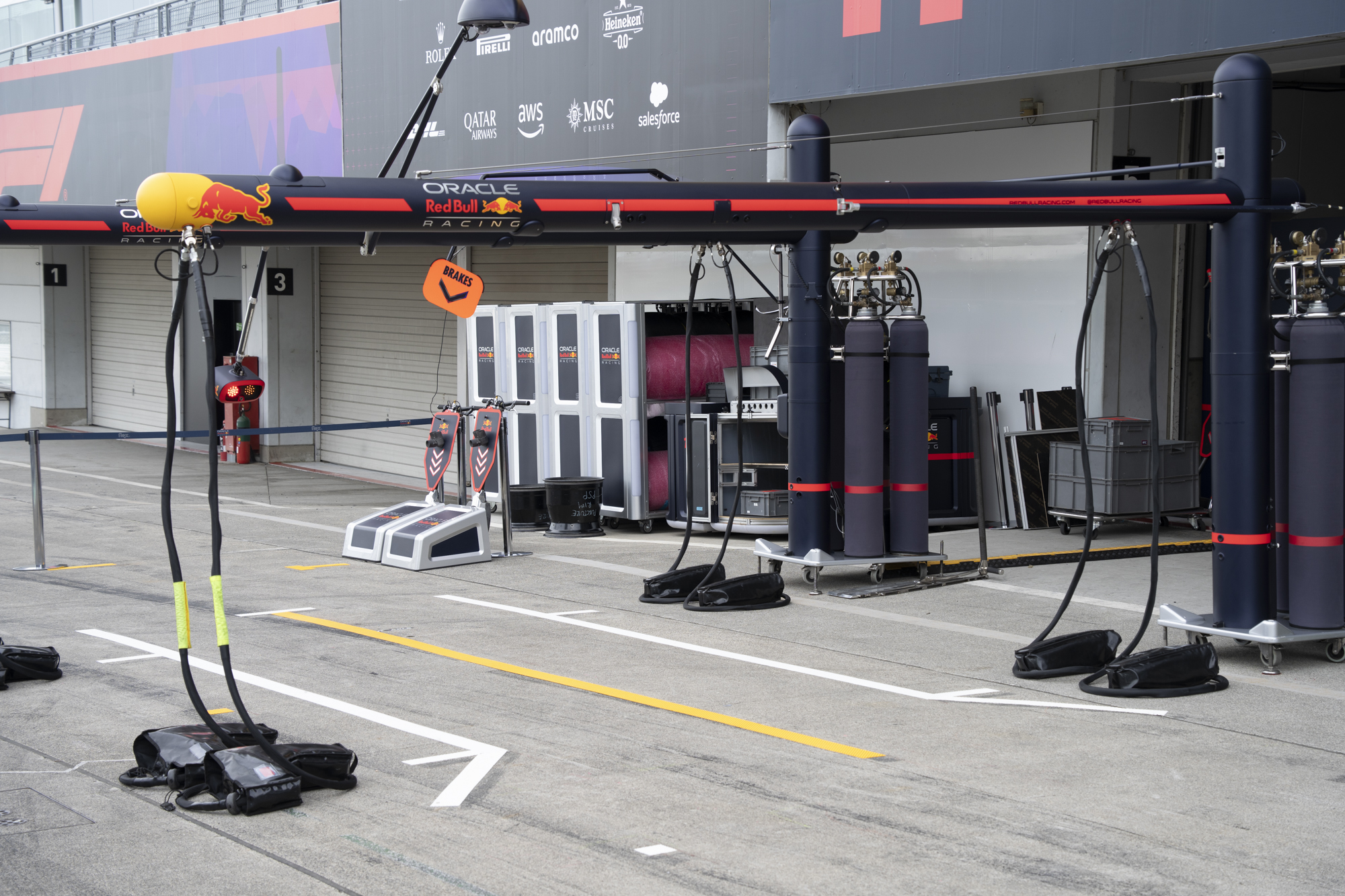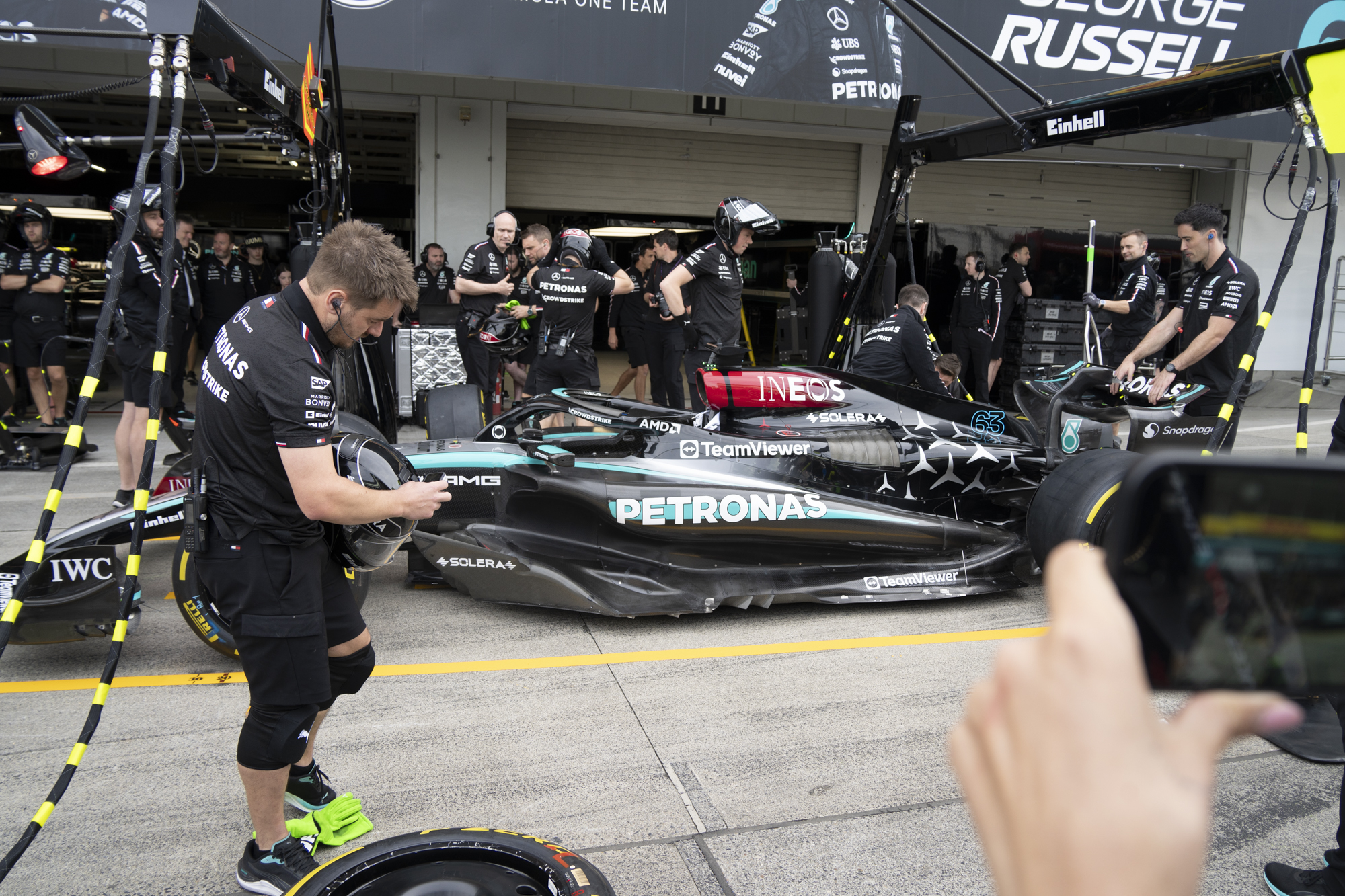 세이프티카와 하스팀의 핏크루들이 관람객들에게 보여줄 겸 연습 겸 타이어 교체를 하기 위해 대기하고 있다.