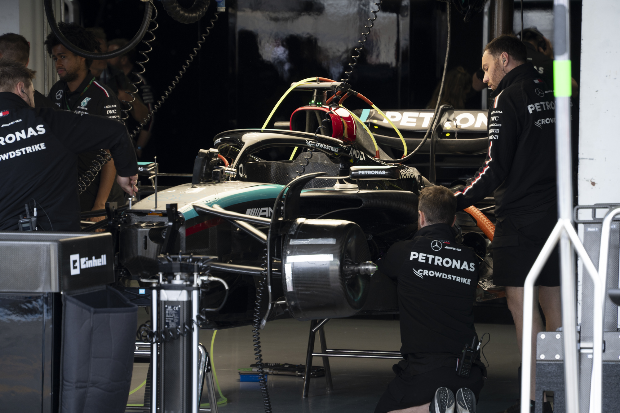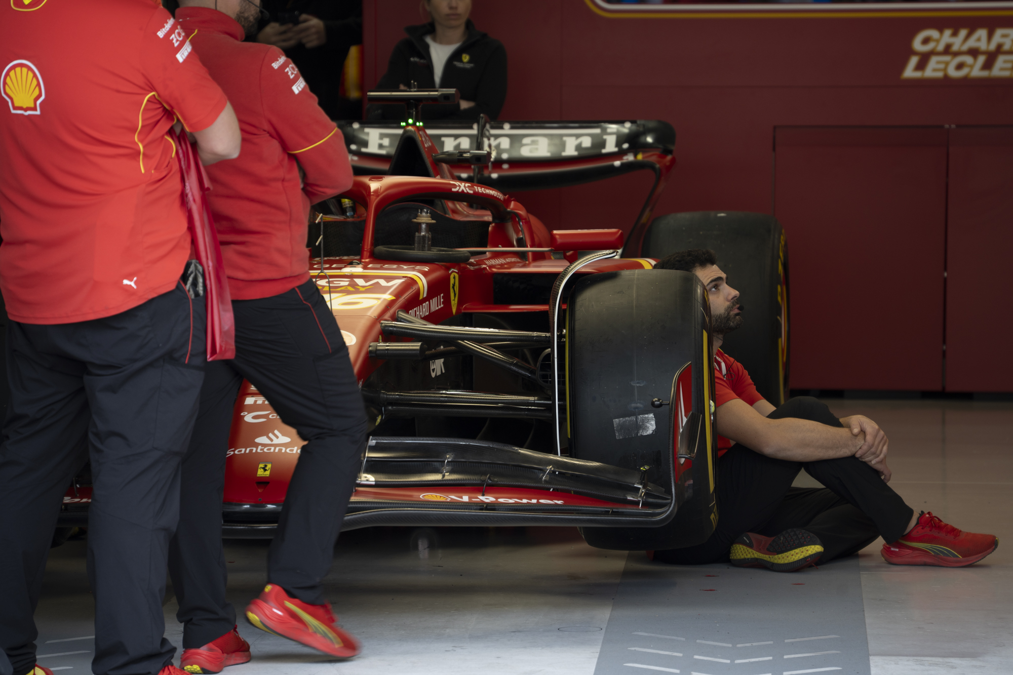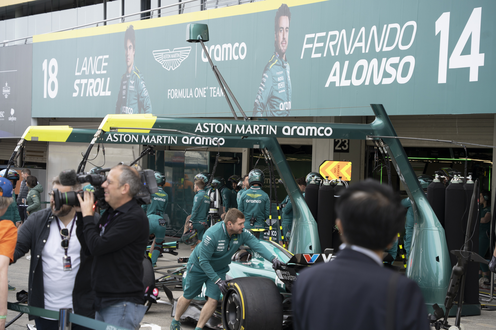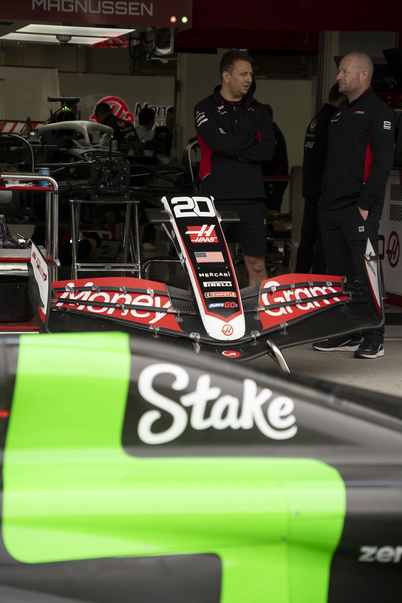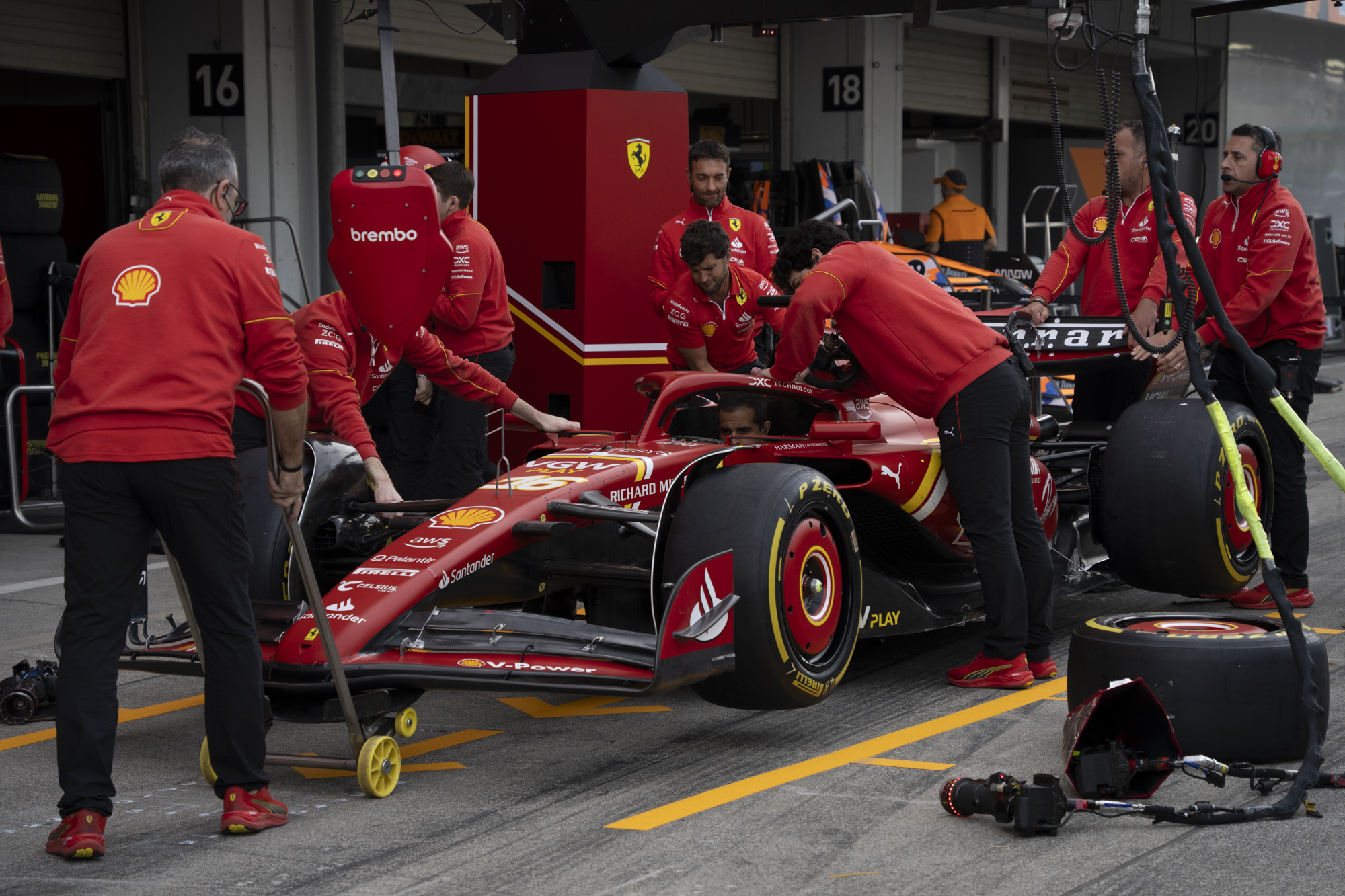 세이프티카와 하스팀의 핏크루들이 관람객들에게 보여줄 겸 연습 겸 타이어 교체를 하기 위해 대기하고 있다.