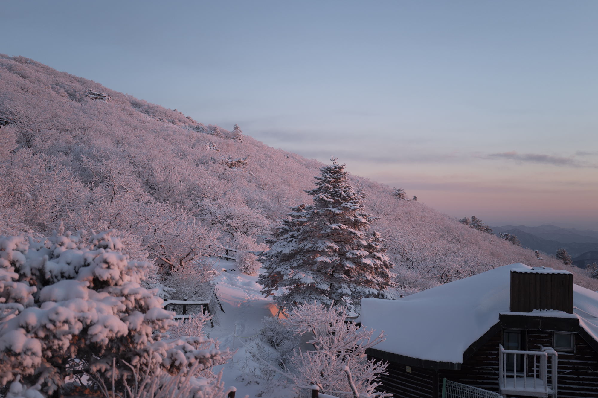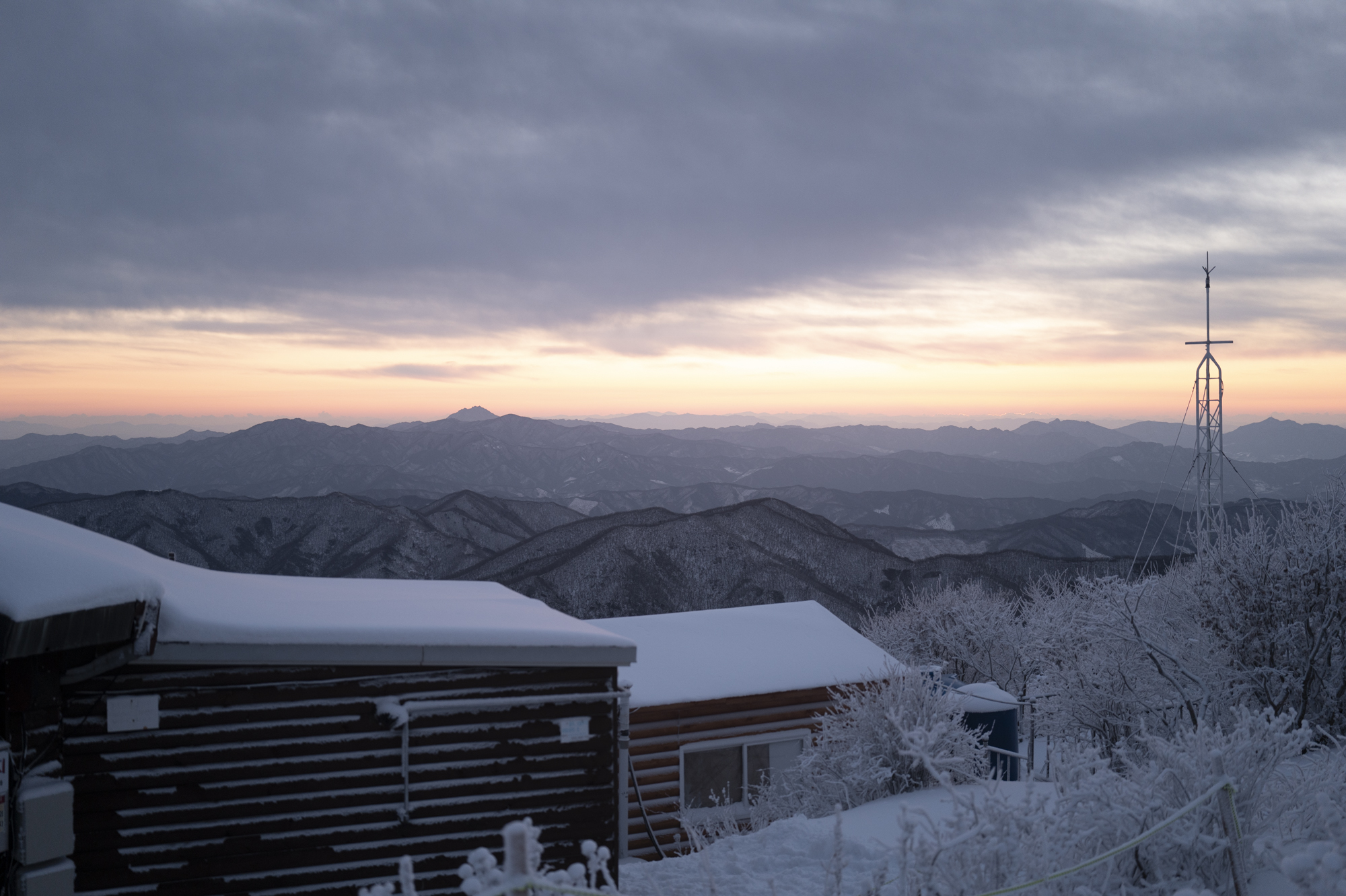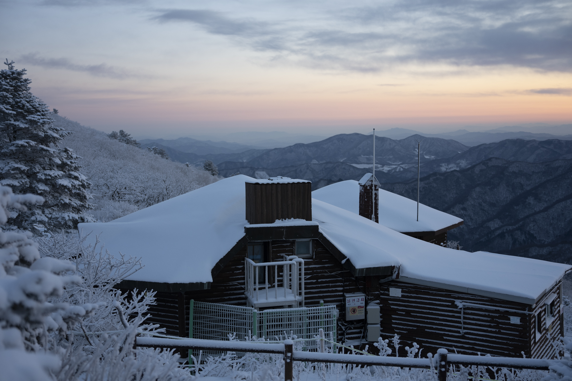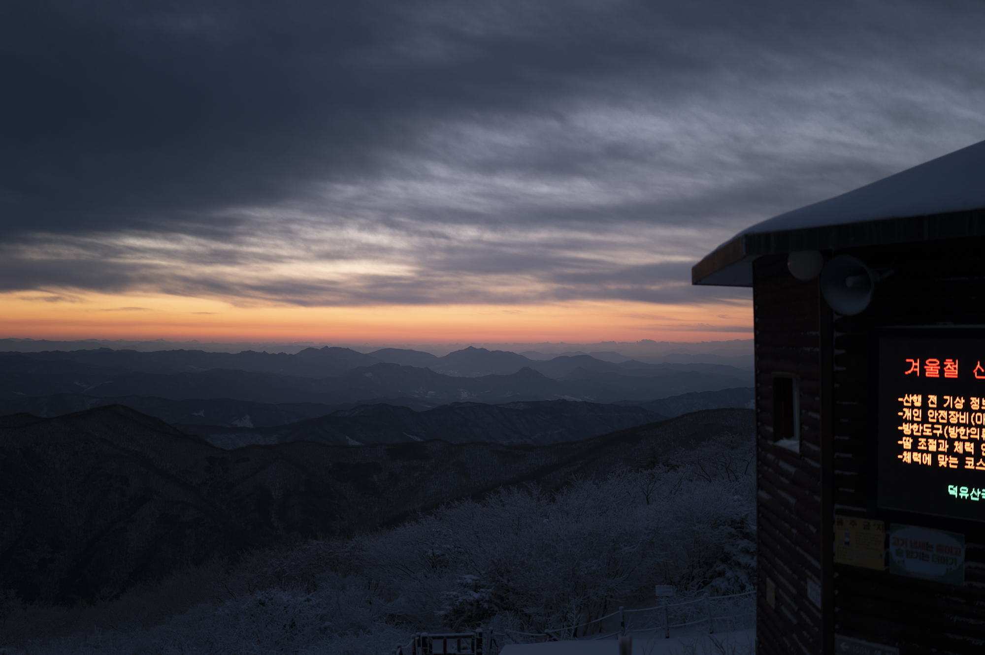 식사를 마친 후 소등 전에 잠깐 산책을 했다. 흐린 날이라 별 하나 보이지 않았지만, 투명하게 남은 일몰의 빛으로 덕유산의 멋진 풍광을 조금이나마 볼 수 있었다. 부디 내일은 좋은 날씨로 이곳까지 보람이 있기를 기도하며 잠을 청했다.