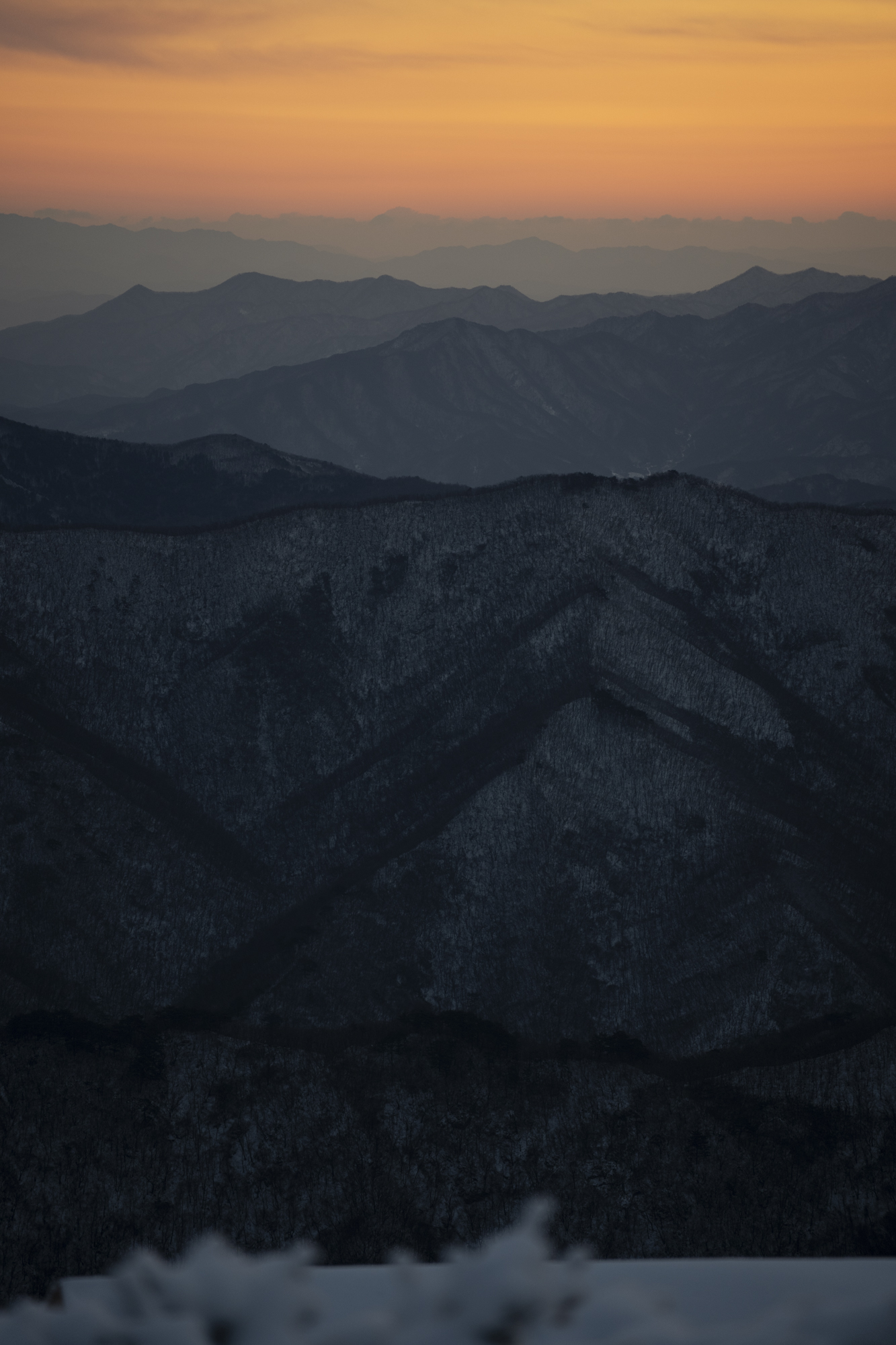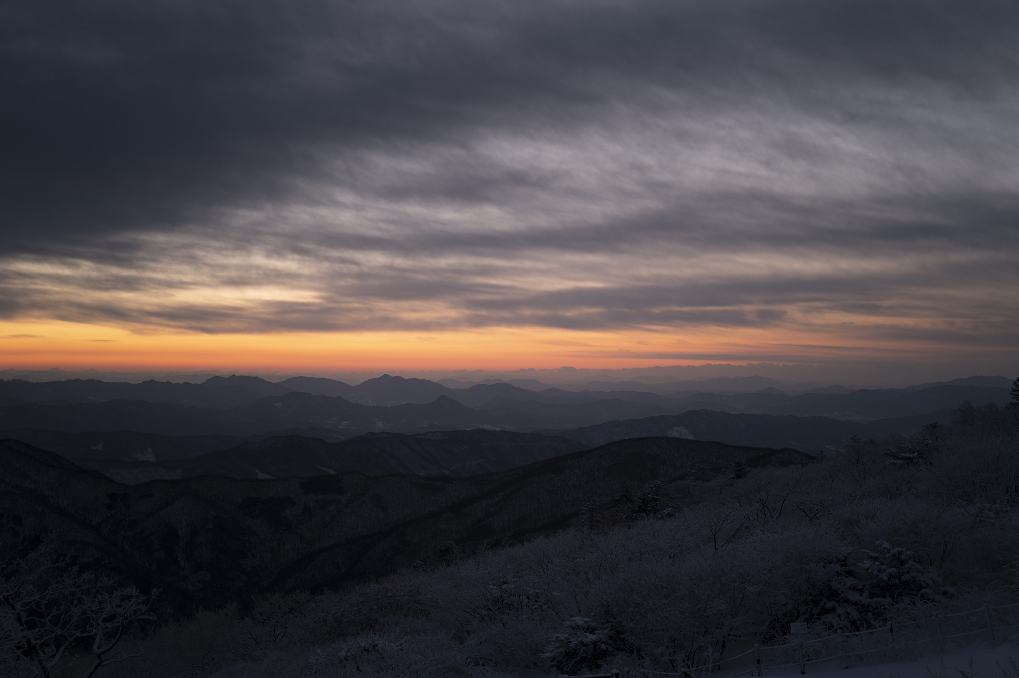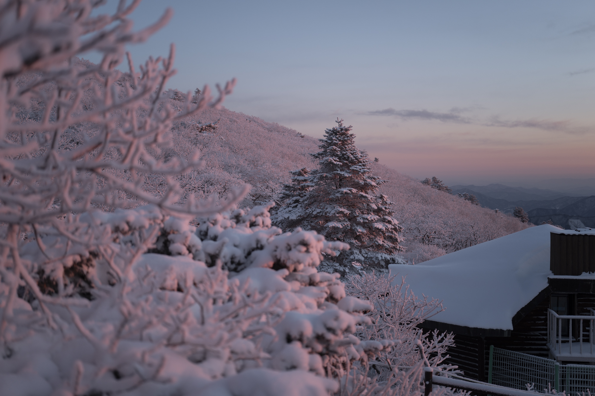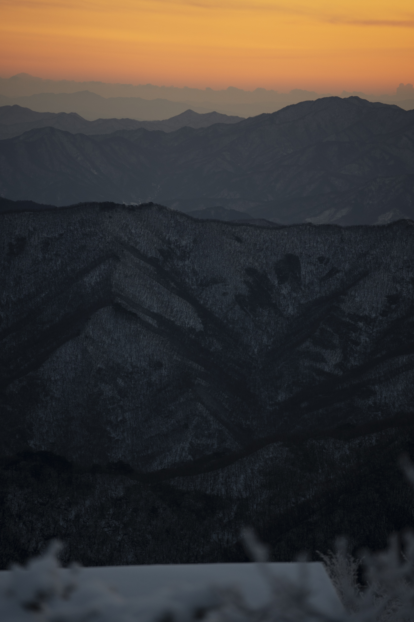 식사를 마친 후 소등 전에 잠깐 산책을 했다. 흐린 날이라 별 하나 보이지 않았지만, 투명하게 남은 일몰의 빛으로 덕유산의 멋진 풍광을 조금이나마 볼 수 있었다. 부디 내일은 좋은 날씨로 이곳까지 보람이 있기를 기도하며 잠을 청했다.