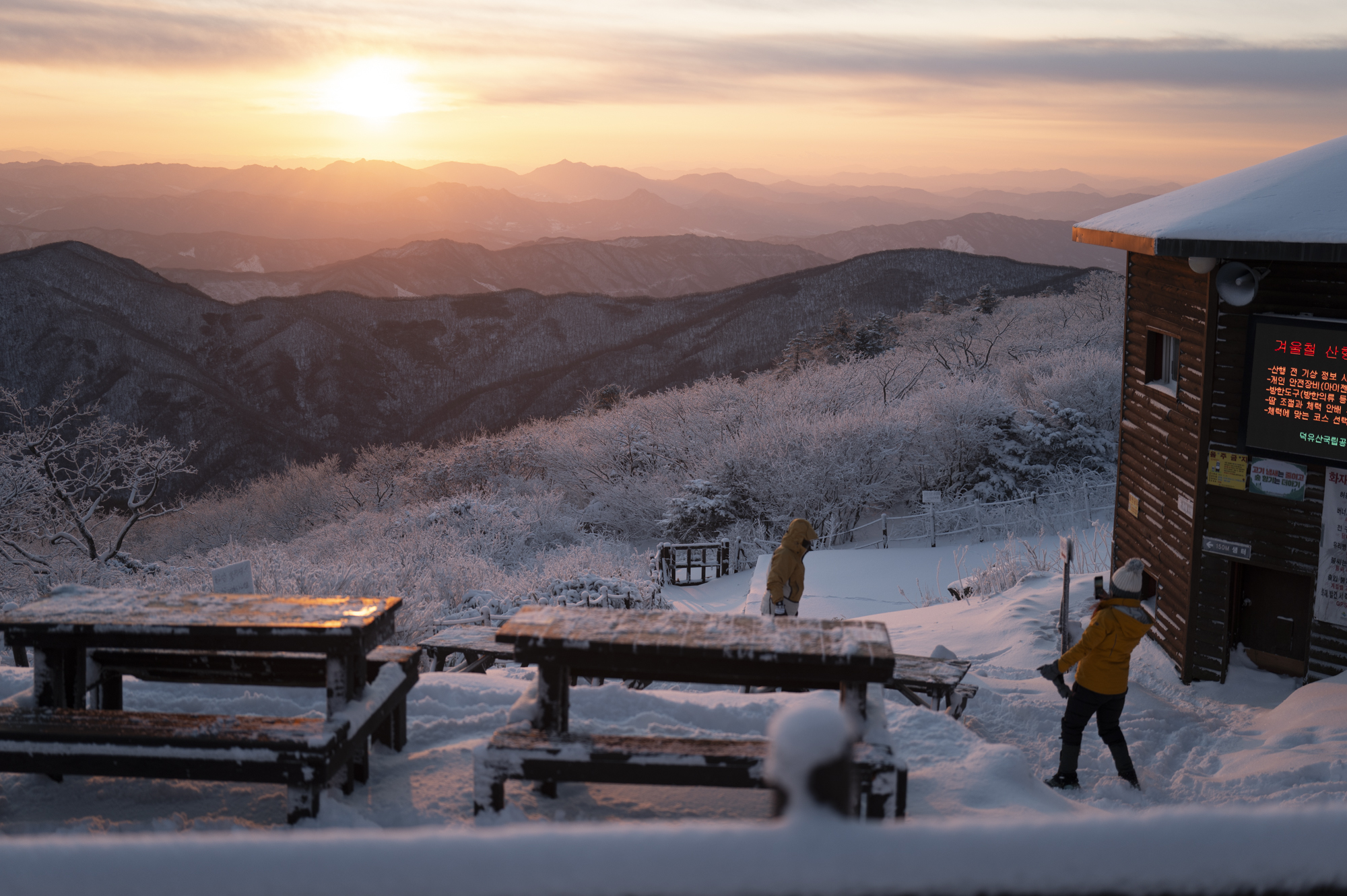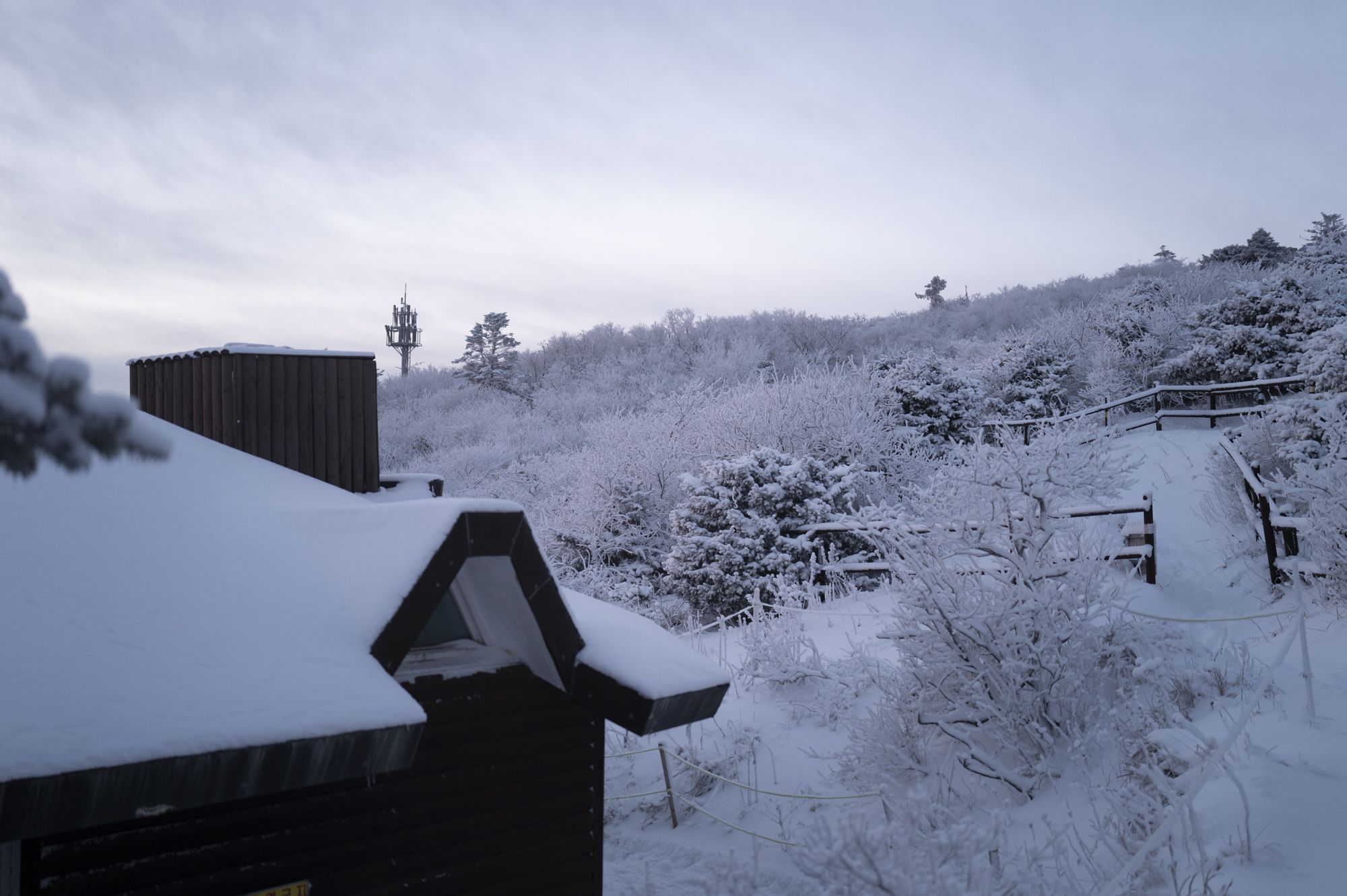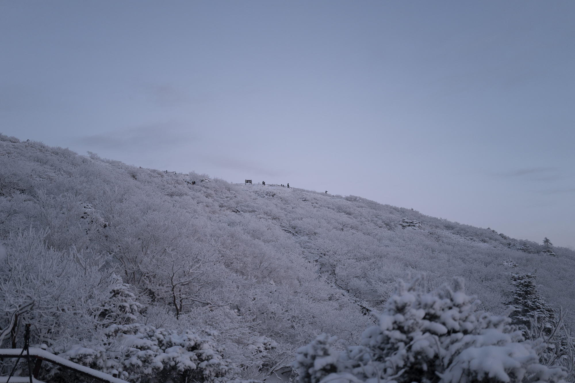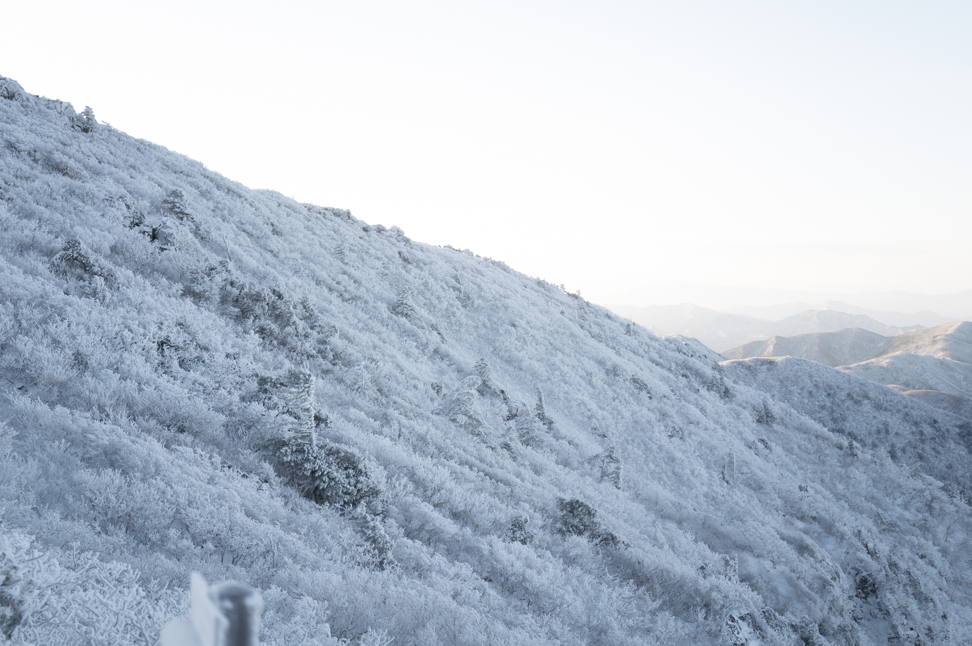 덕유산 정상 향적봉에는 두 갈래로 사람들이 줄지어 서있었다. 정상봉 인증샷을 찍기 위함이다. 인기 좋은 산이라면 쉽게 볼 수 있는 풍경이다. 나는 그들을 지나쳐 대피소로 향했다. 불필요한 짐을 두고 잠깐의 산행을 즐기기 위해서다. 리조트로 향하는 하행 곤돌라의 막차는 오후 4시 30분이라서, 4시에 나오면 사람이 없어서 여유롭게, 앞마당처럼 정상을 즐길 수 있다. 시야는 좀처럼 나아지지 않아 내일을 기약하며 대피소로 복귀했다.
