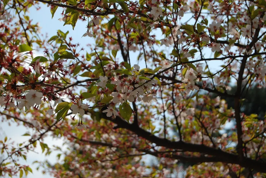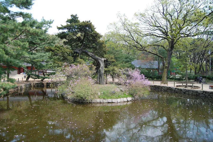 입구쪽에 있는 연못. 꽃잎이 떨어져 물위에 둥둥.....