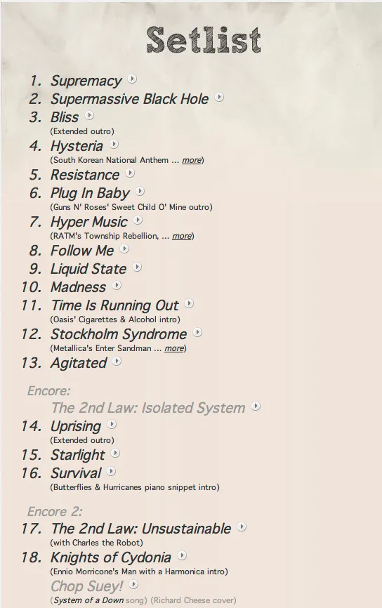 캬.. 뮤즈다. 앨범이 나올때마다 더 큰 감동을 주는 우리의 뮤즈 단독 콘서트 한번 밖에 안 갔지만 뮤즈 음악에 대한 애정은 남다른 나. 정말 너무너무 기다린 뮤즈의 라이브. 지난 단독 콘서트 이후 발매된 앨범들이 아주 그냥 진국이라 더욱 기대했다. 물론 그 기대는 저버러지 않았지. 화려한 연주와 노래는 물론 아름답고 멋있는 영상과 조명은 퍼펙트. 중간에는 거대한 로봇의 출연에 더 몰입..