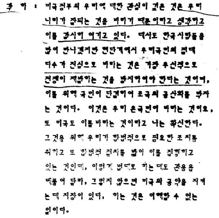 당연히, 예상 가능하게도, "그거는 절대 못해, 꺼져" 였습니다. 그러면서 김대중을 석방할 수 없는 이유에 대해서 매우 분노한 어조로 스나이더 대사에게 항변하죠. 그 반란분자는 절대로 그냥 풀어줄 수 없다고요. 이때 박정희가 흥분해서 말하는 내용을 보면, 박정희가 김대중을 어떻게 바라보고 있는지, 민주주의에 대해서 어떻게 생각하고 있는지 아주 명백하게 드러납니다.