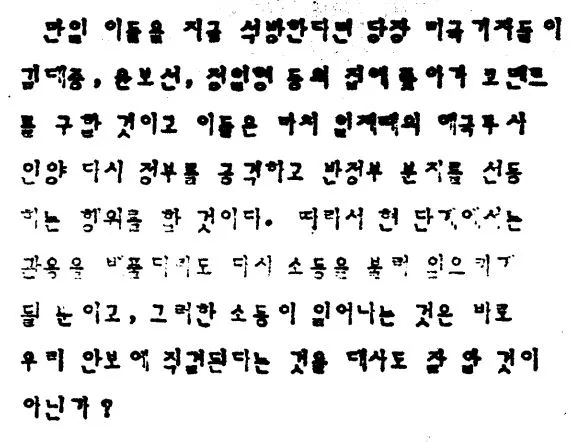 그들은 그들의 정치적 목적만 달성되면 나라는 망해도 좋다는 생각이다. 지금 주한미상군의 철수문제로 떠들썩한 이 때에 학생이 데모를 하고 반정부 분자가 움직임을 보이면 당장 외신은 한국의 정정이 불안하다고 보도할 것이고 그렇게 되면 외국 사람들도 불안감을 가져 우리와의 경제협력이나 통상을 꺼리게 될 것이다. 또 국내 기업가도 불안을 느끼게 될 것이다. 그러면 국가에 도움이 될 것이 무엇이 있겠는가?"