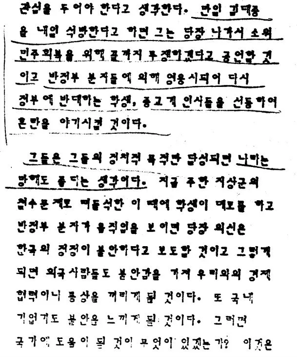 "만일 김대중을 내일 석방한다고 하면 그는 당장 나가서 소위 민주회복을 위해 끝까지 투쟁하겠다고 공언할 것이고 반정부 분자들에 의해 영웅시되어 다시 정부에 반대하는 학생, 종교계 인사들을 선동하여 혼란을 야기시킬 것이다.