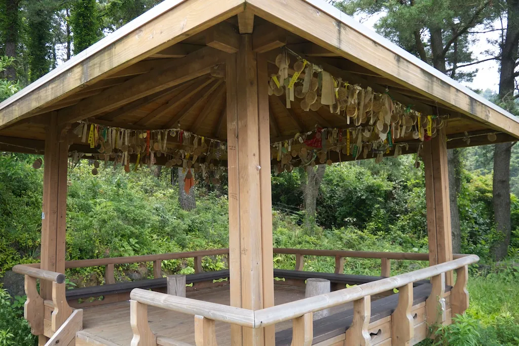 두산봉을 오르기 전에 있는 누각? 정자? 인데 사람들이 리본에 메시지를 적어 메달아 놨다.