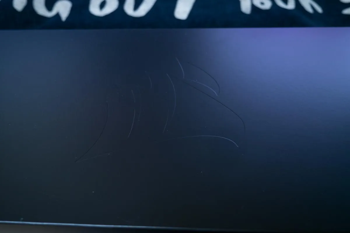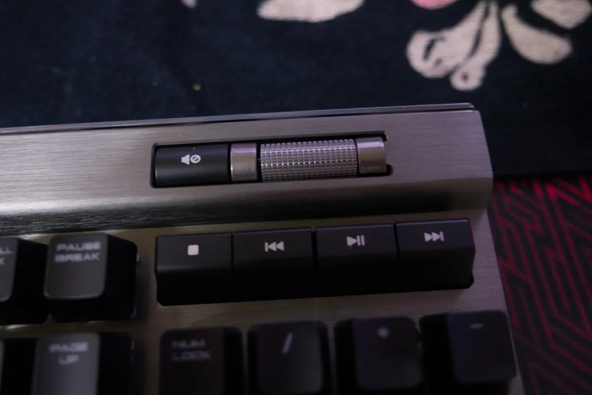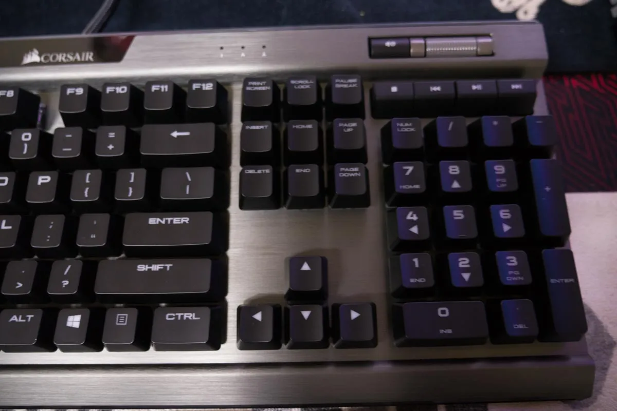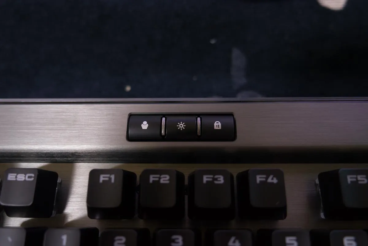 전체적인 레이아웃의 특이점은 없고 상단에는 볼륨 조절, LED설정, 윈도우 락 키 버튼이 구성되어 있고, 가운데 커세어 로고와 상단 테두리에도 LED 불빛이 은은하게 나오게 된다.