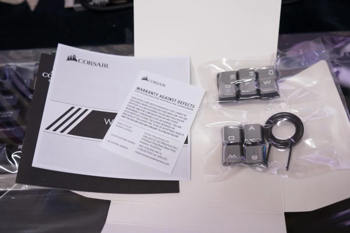 구성품은 키보드 본체와 설명서 및 워런티 문서 그리고 FPS 게이밍시 자주 자주 사용하는 키캡을 별도로 제공하고 있다.