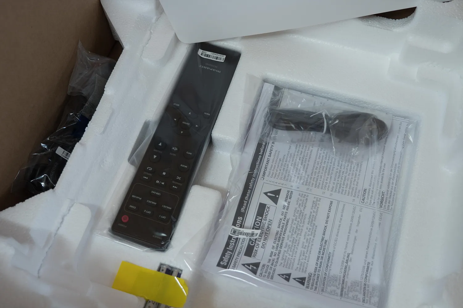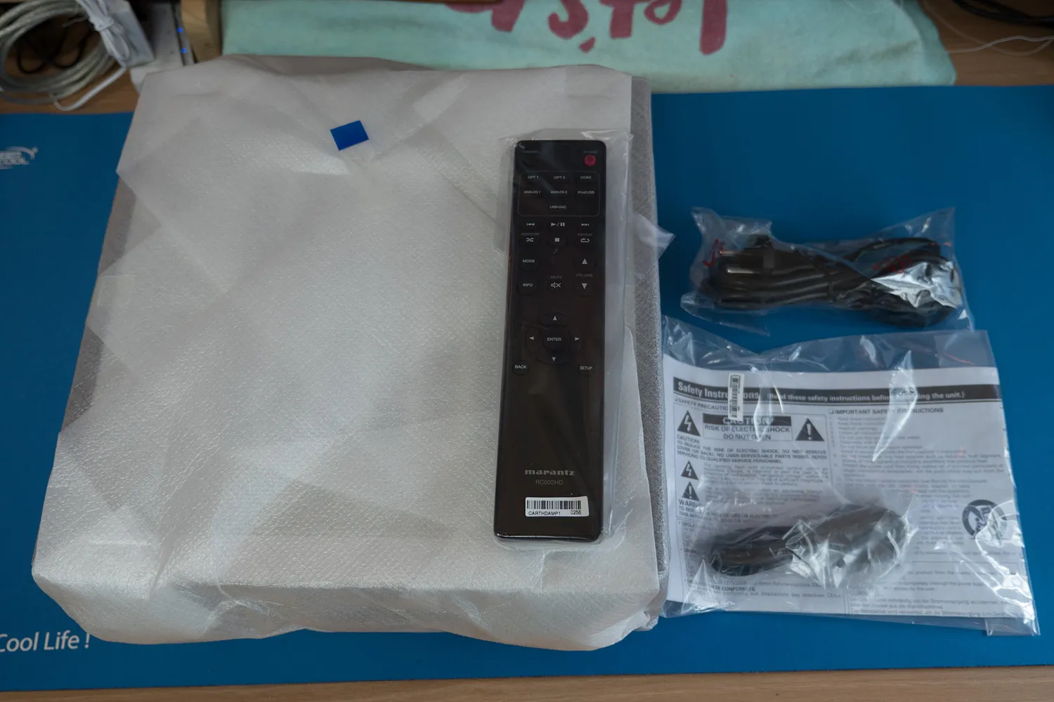 구성품은 앰프, 리모컨, 파워케이블, USB 케이블 그리고 건전지가 들어있다.
