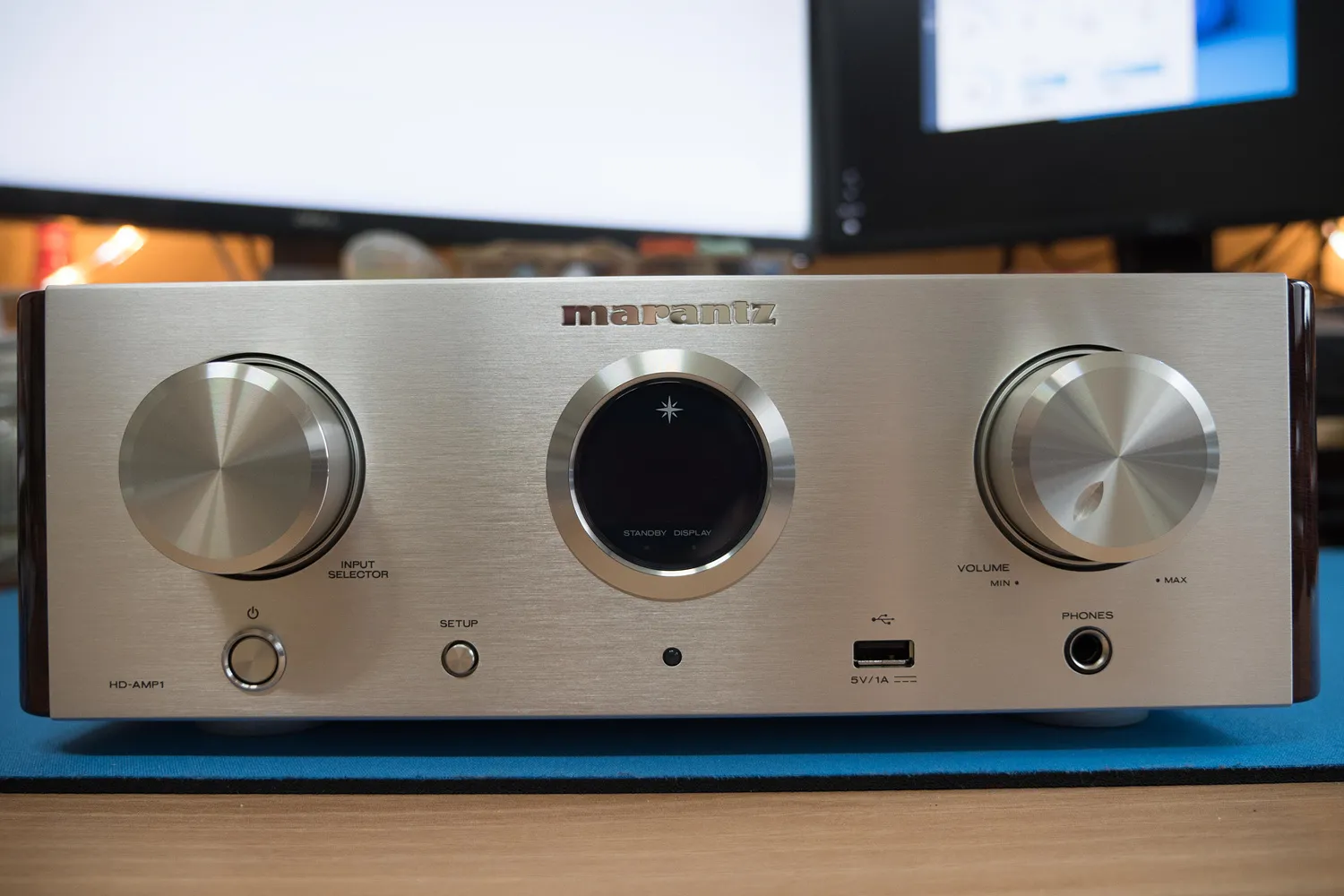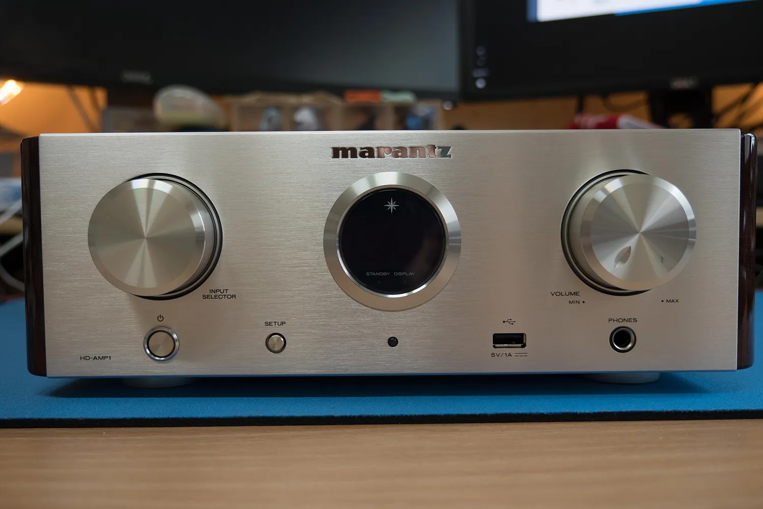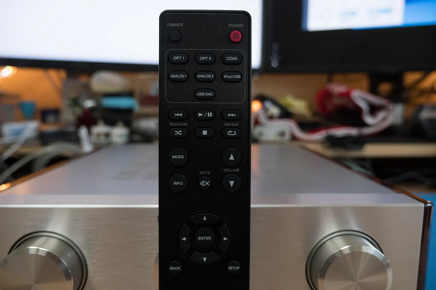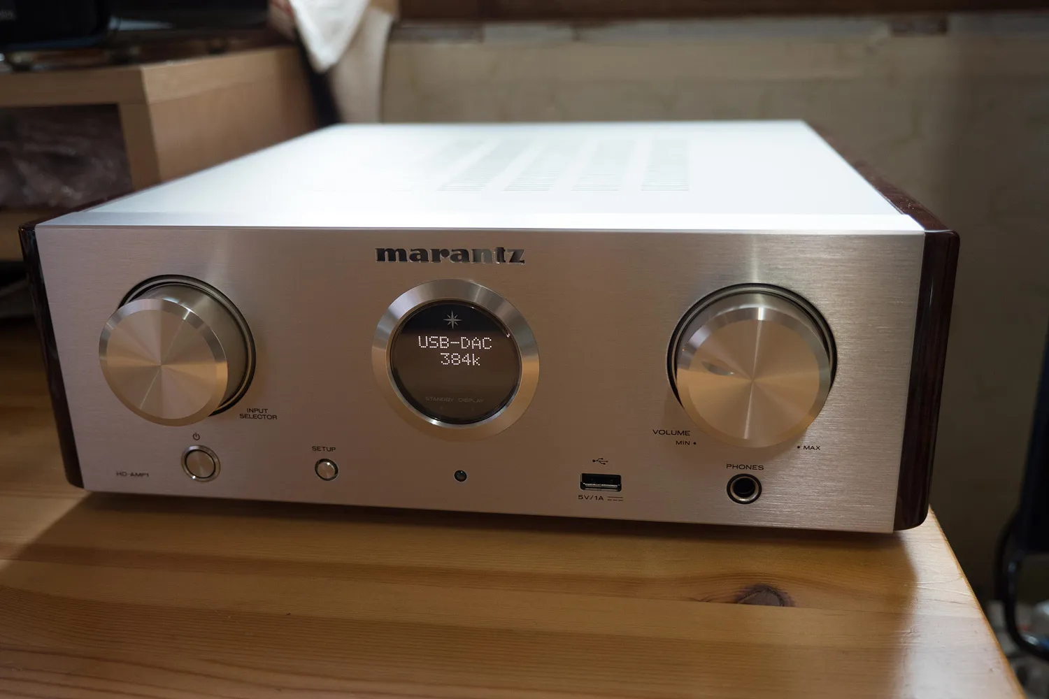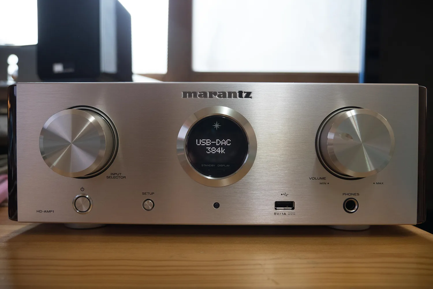 왼쪽부터 입력 셀렉터, 간단한 정보를 표시하는 디스플레이, 볼륨 조절 단자.