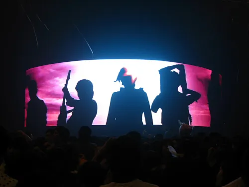 현수막이 걷히고 궁든 스크린이 위로 열리면서 무대뒤쪽에 피라미드가 보이기 시작했다.