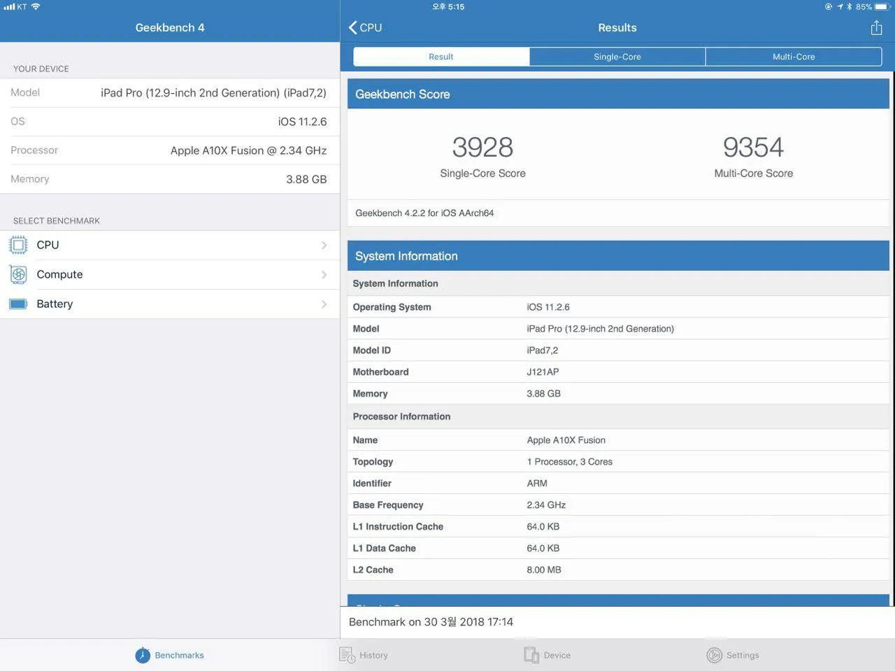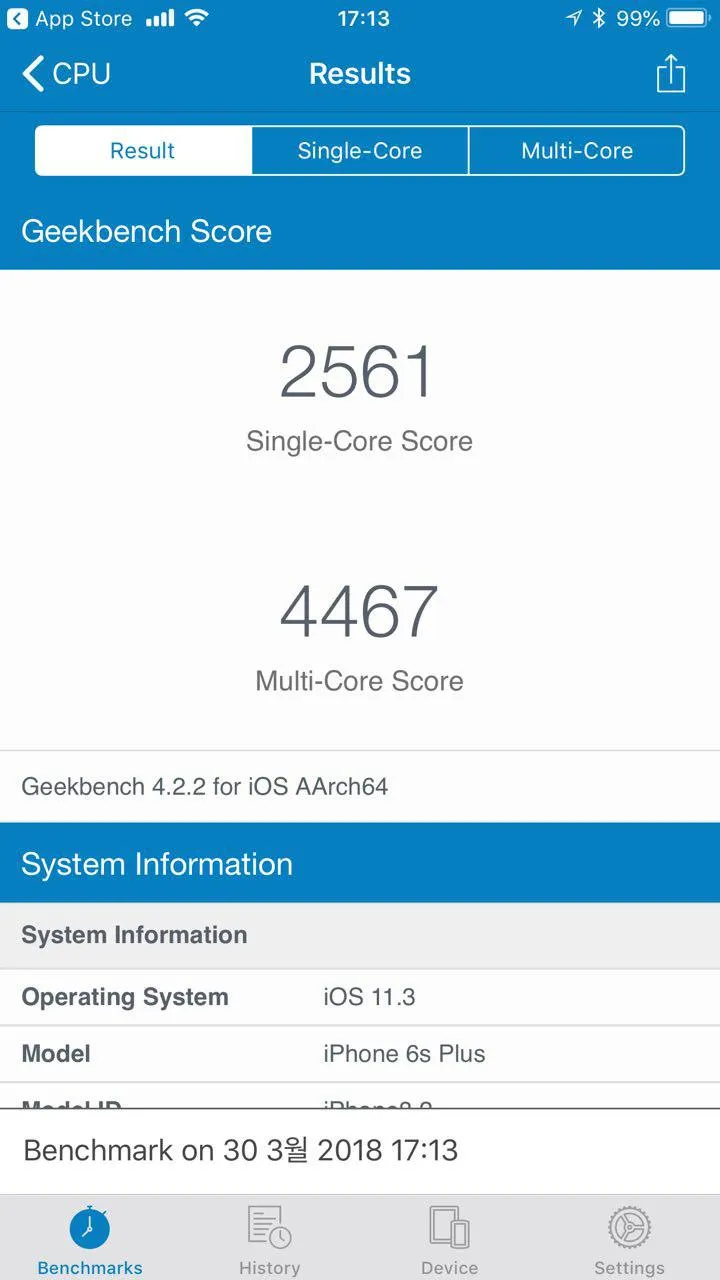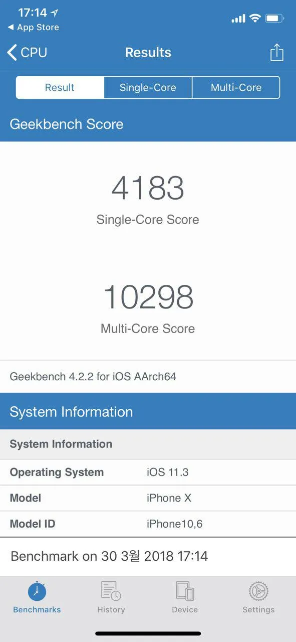최근 아이폰의 배터리 게이트 이후 많은 사람들이 긱벤치4앱을 통해서 자신의 아이폰 성능을 체크하는 사람이 많았는데, 몇일전에 갑자기 궁금해서 앱을 구입하고 내가 가진 iOS 3개의 기기에 테스트를 해 보았다.