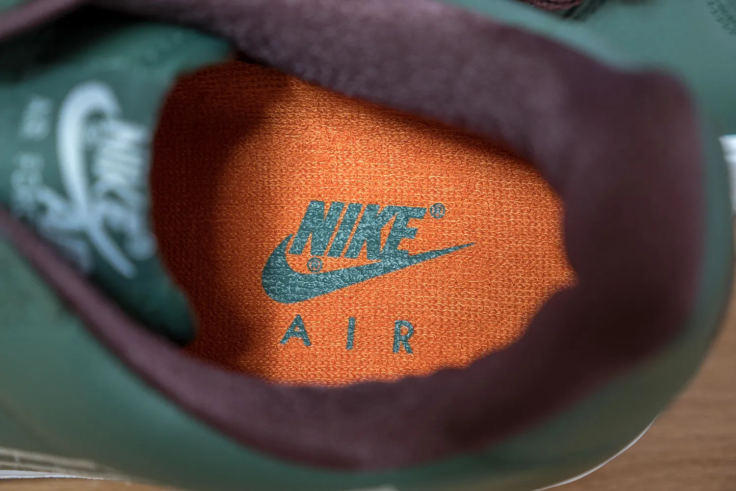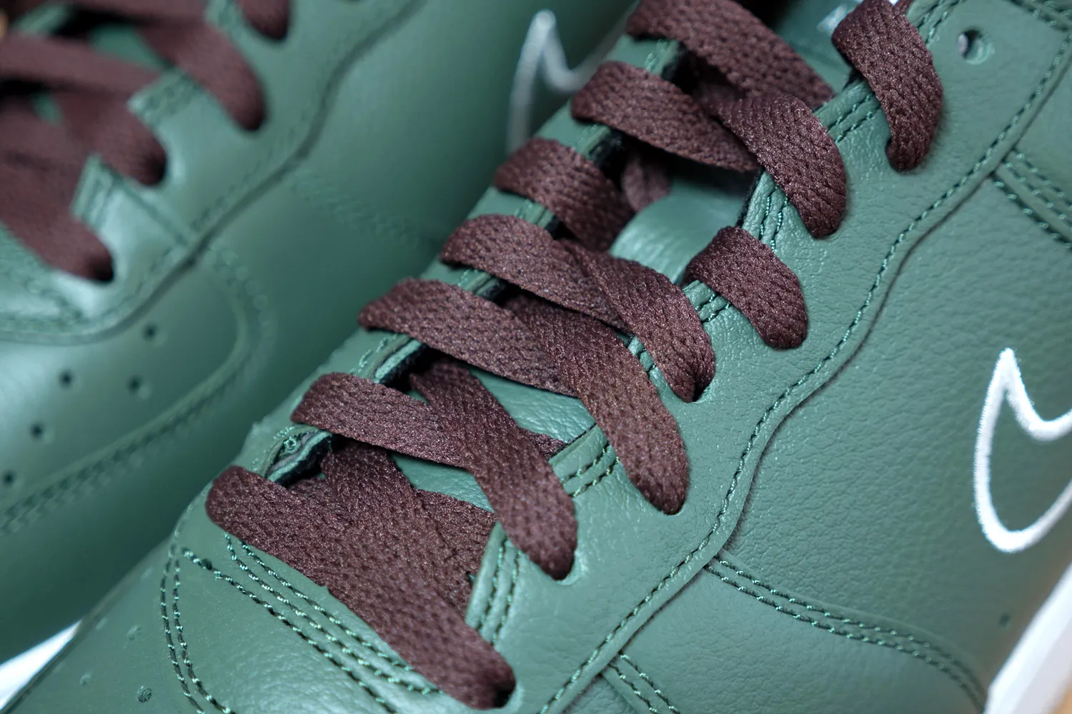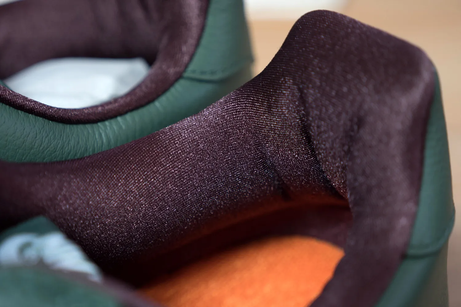 흰색의 아웃솔과 테두리로만 새겨진 스우시 그리고 전체를 감싸는 숲의 색과 나무 색을 뜻하는 듯한 신발 내부와끈.