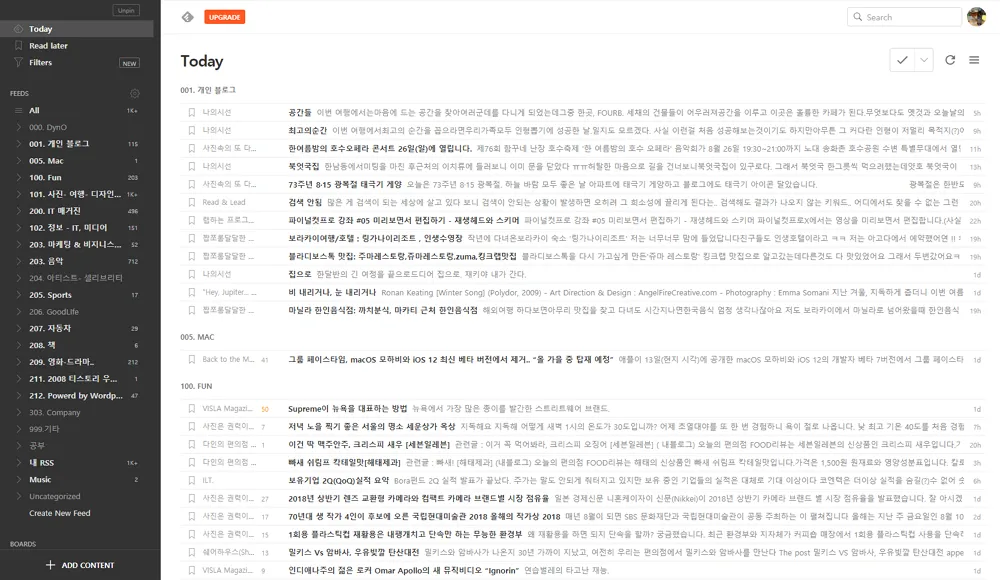 ※ 피들리는 아주 오래전부터 국내 대표 RSS 서비스 였던 한RSS가 서비스를 종료하면서 찾은 새로운 보금자리이며 내가 알고 있기론 유일무이한 RSS서비스다. 10년 넘게 좋은 블로그를 등록해 놓고 여전히 RSS라는 좋은 시스템을 잘 이용하고 있다. 몇년전 이 RSS 발명가가 고인이 되었다는 소식을 들었을 떄 마음 속으로 진심으로 고인의 명복을 빌었던 일도 생각난다.