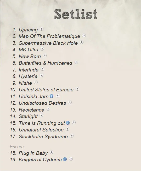 Hole, Resistanve, Starlight, Time is Running Out, Stockhom Syndrome 정도?