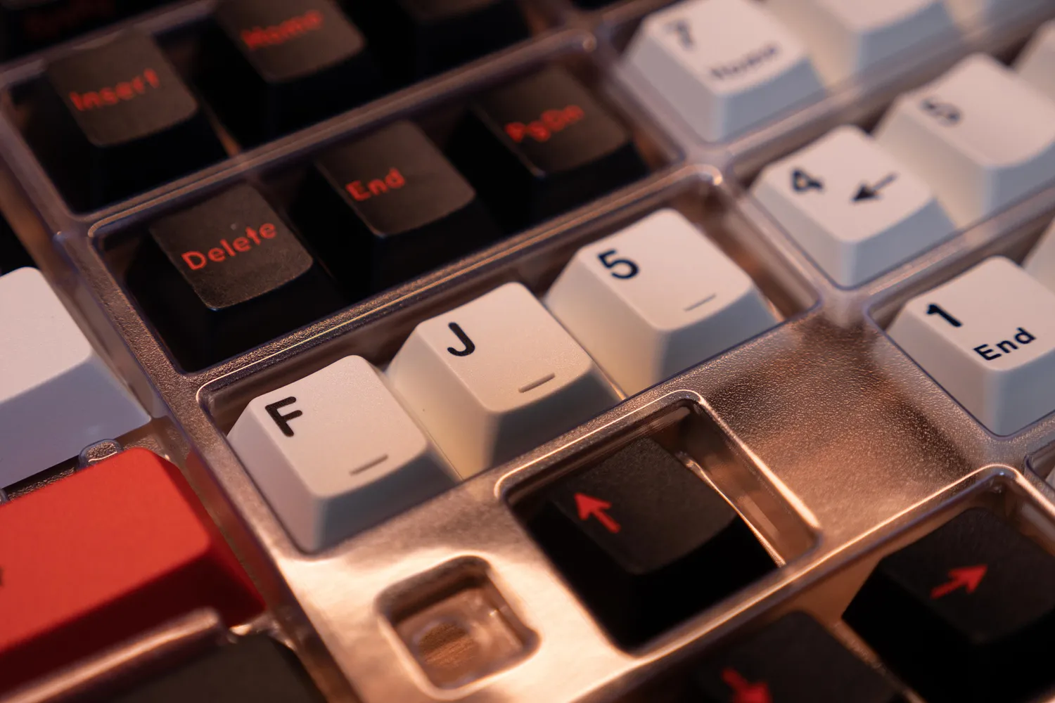 키보드의 중심점이 되는 F, J, 5 키에는 돌기가 있는 키캡이 별도로 구성되어 있어서 좋다. 돌기가 없으면 조금은 불편한게 사실.